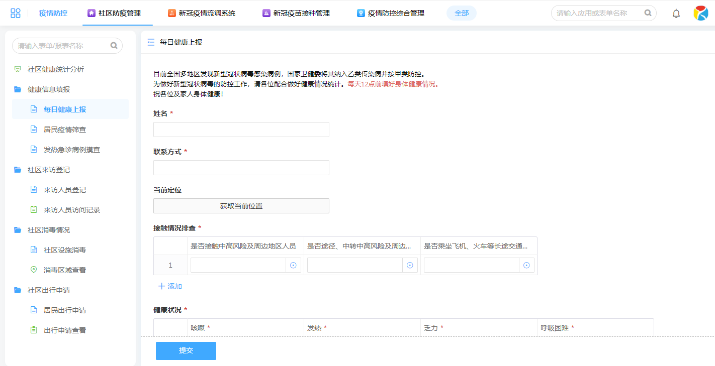 数字化社区防疫有利于把控社区居民的健康指数,降低可疑病例传播速度,提高防疫效率。本系统从疫情防控常态化管理的日常要求出发,严格记录社区居民的每日健康状况,对于外来人员进行详细的行踪登记,社区消毒情况与外出申请都借助平台实现实时录入、查看。能够有效提升社区管理的规范度,让居民更安心。