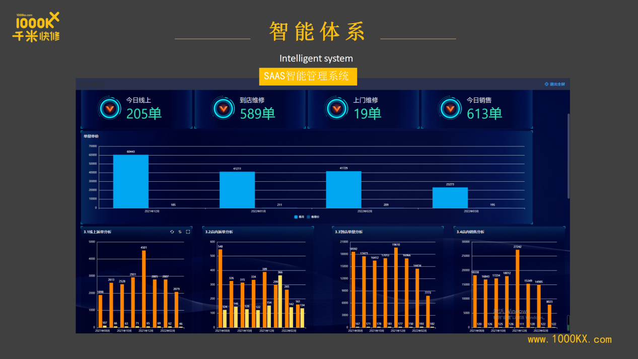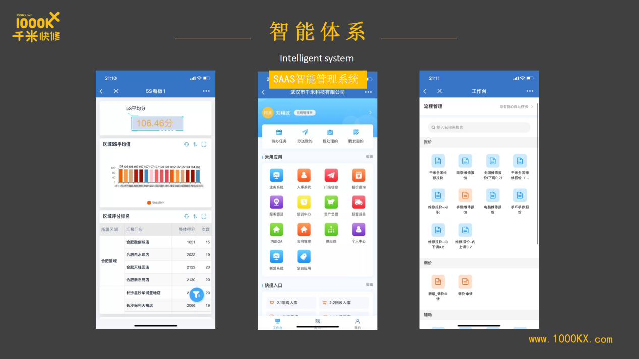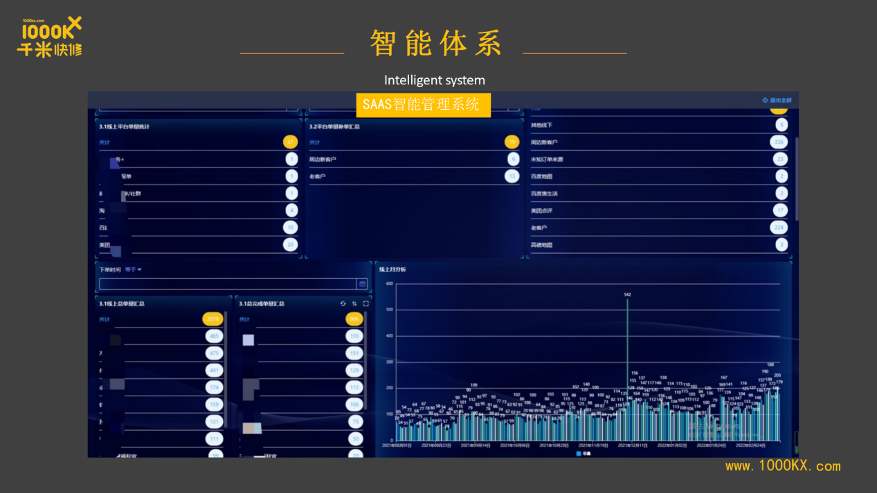 千米快修选择闪搭搭建SaaS智能管理系统,从人、钱、事、物四个维度进行应用开发配置,实现包括门店员、财务、销售、库存等多板块智能管控。