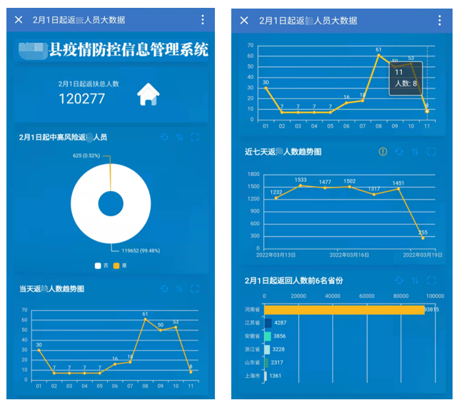 用于汇总登记的返乡人员信息,多类型图表可用于分析中高风险返乡人员占比、各省市返回人数排名、近期返乡人数走势等等。