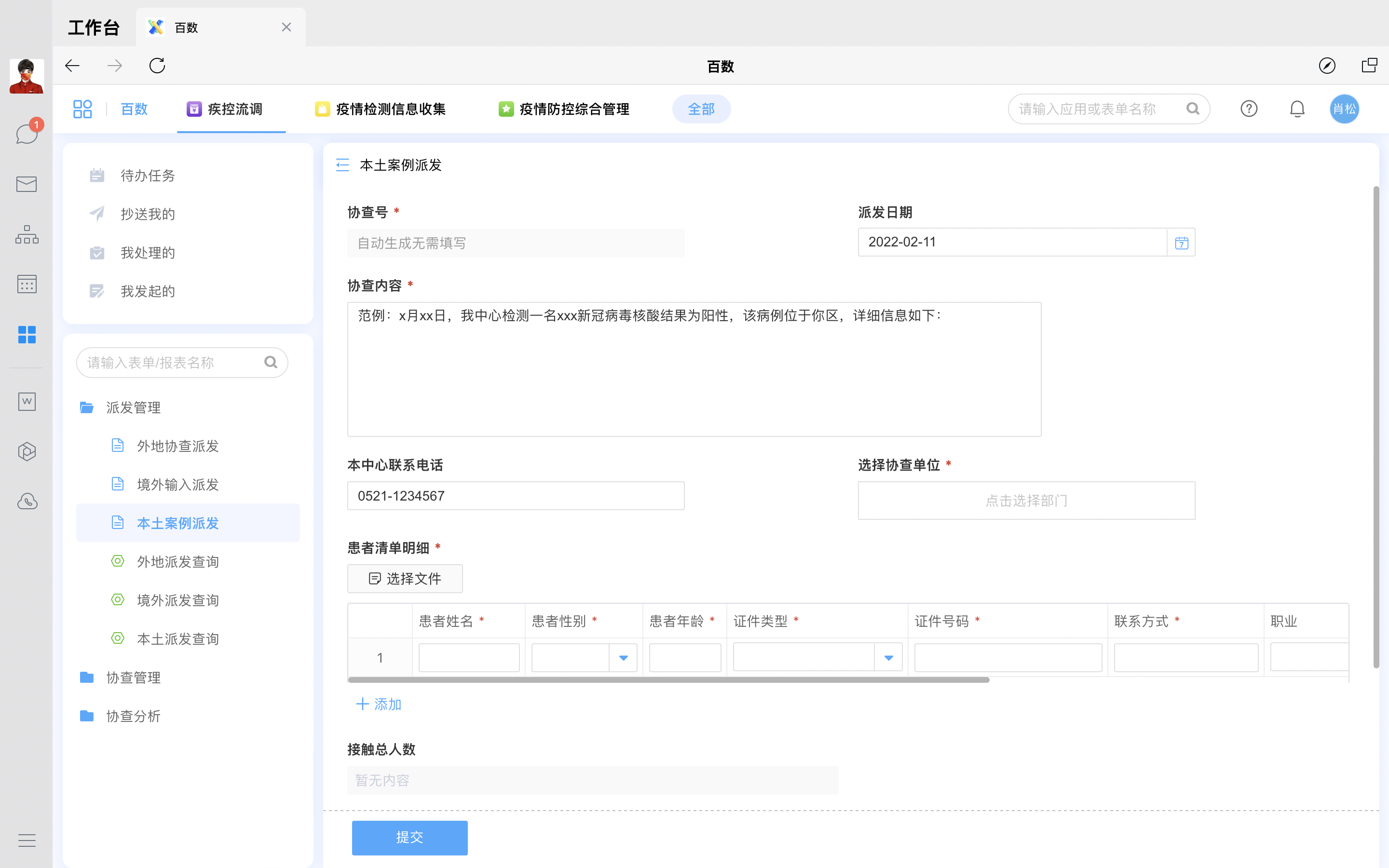 新增病例人员通过在线表单录入填写病例人员信息,由疾控中心流程管理分配任务给区域负责人开展流调工作。