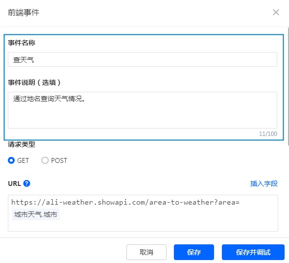 添加好前端事件后,首先设置前端事件的基础信息,即事件名称和事件说明,用于区分前端事件: