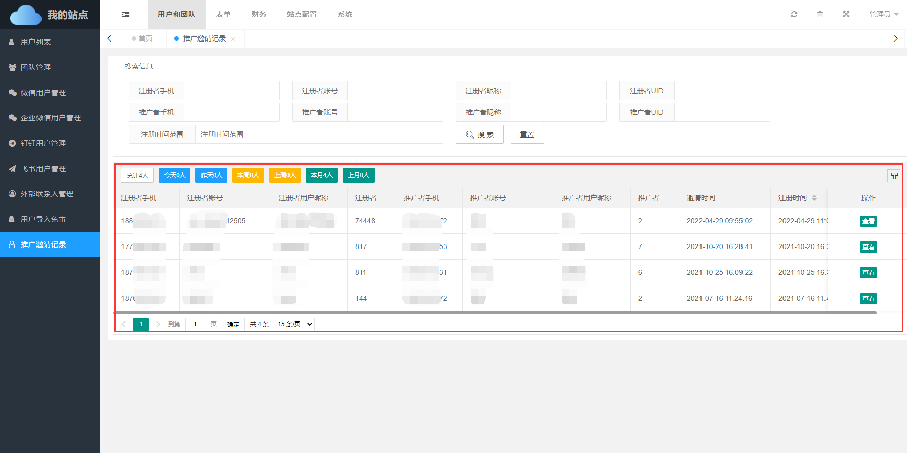 在推广邀请记录页面可以对所有推广邀请进行查看。