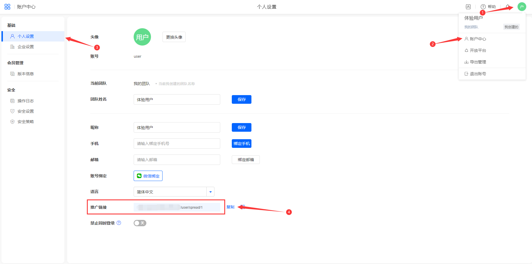 - 推广者账号:推广者用户账号