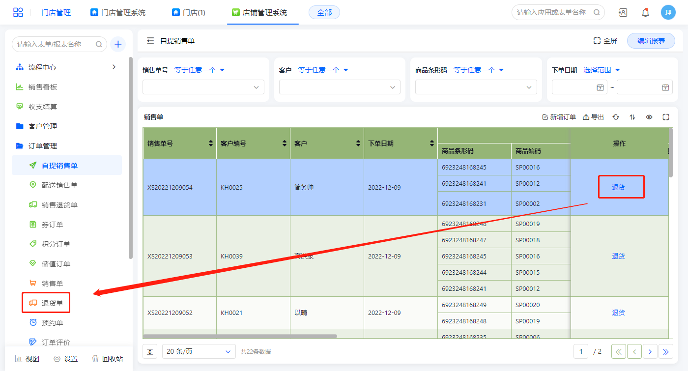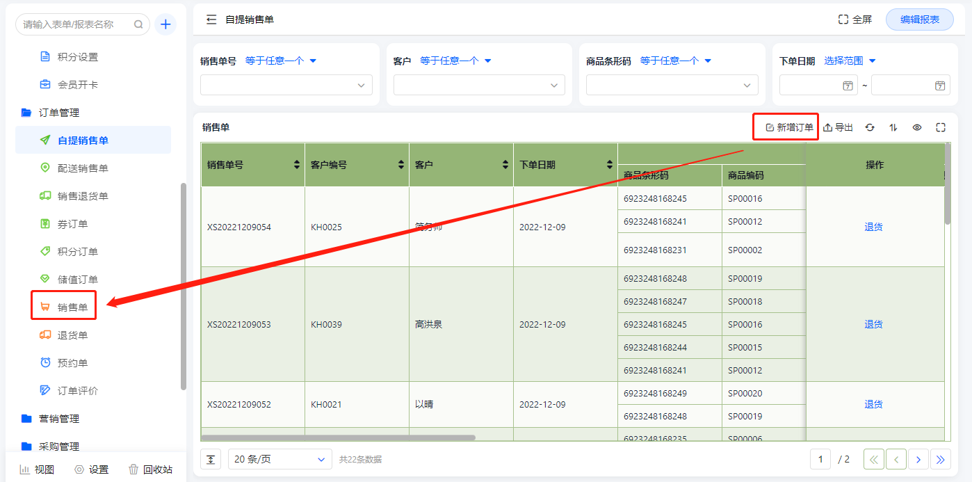 自提销售单报表展示销售单配送方式为自提的销售单信息,在此表单可新增销售单,及操作退货;