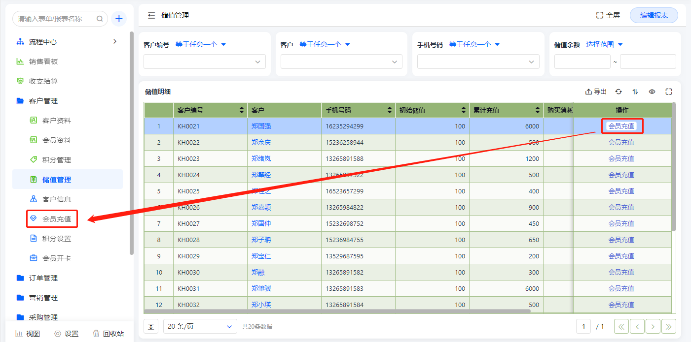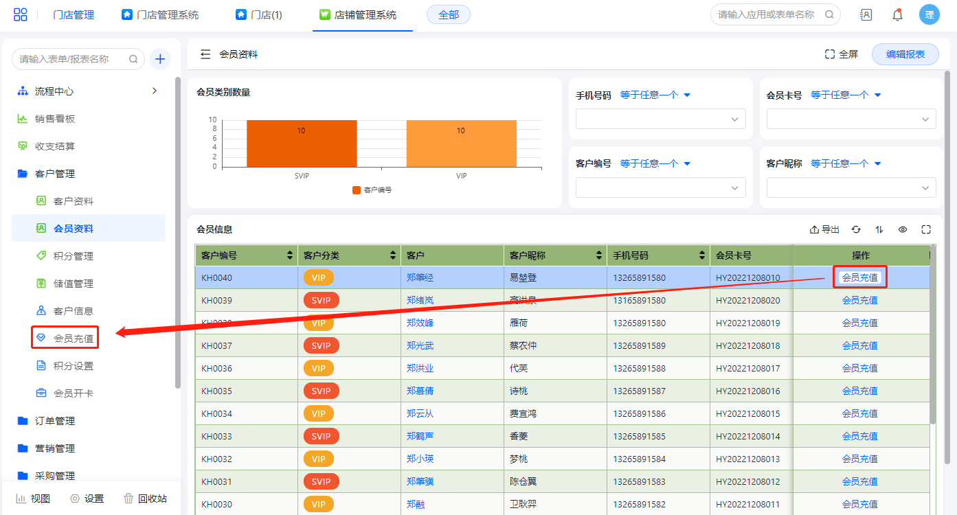 会员资料报表展示所有已经开通会员卡的客户信息,在此表单可操作会员充值;