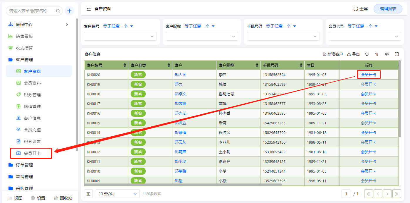 客户资料报表展示所有新客的数据信息,在此报表可进行会员开卡及新增客户操作;