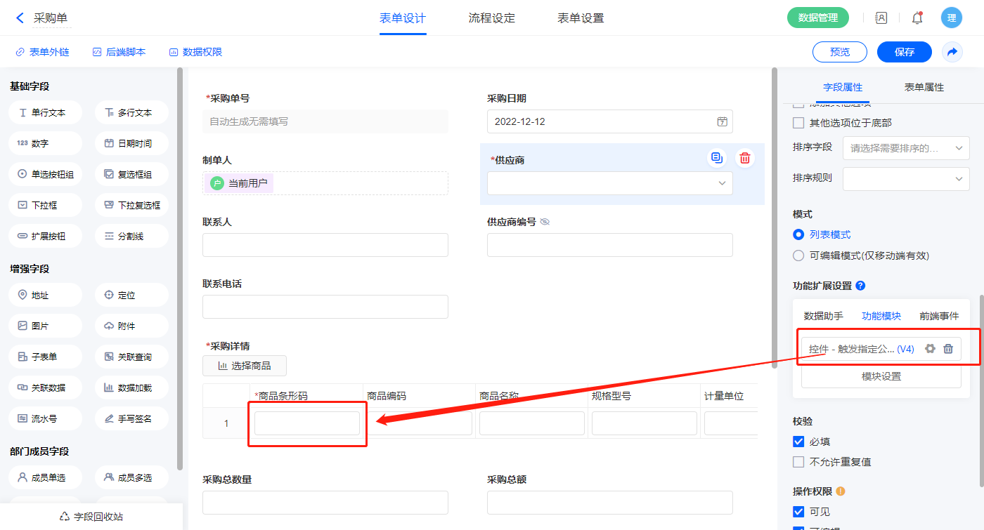 点击商品采购弹出采购单时,库存数量为空,选择供应商之后库存数量会显示,通过功能插件设置触发商品条形码的公式;