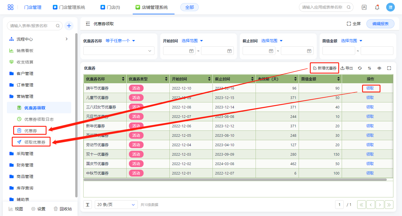 优惠券领取报表展示所有优惠券信息,不包括退货退回的优惠券;在此报表可进行领取和新增优惠券操作;点击新增优惠券弹出优惠券表单;
