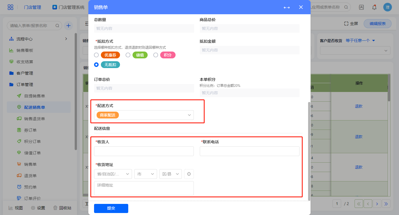 配送销售单展示所有配送方式为商家配送的销售单信息,在该报表可进行新增订单及退货操作,新增订单配送方式默认为商家配送,该方式表单提交后走收发货流程;通过显隐规则显示配送信息;