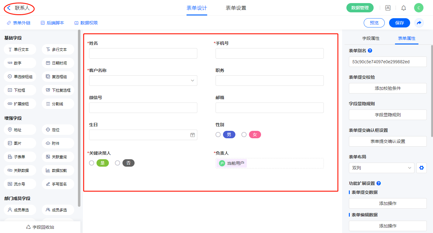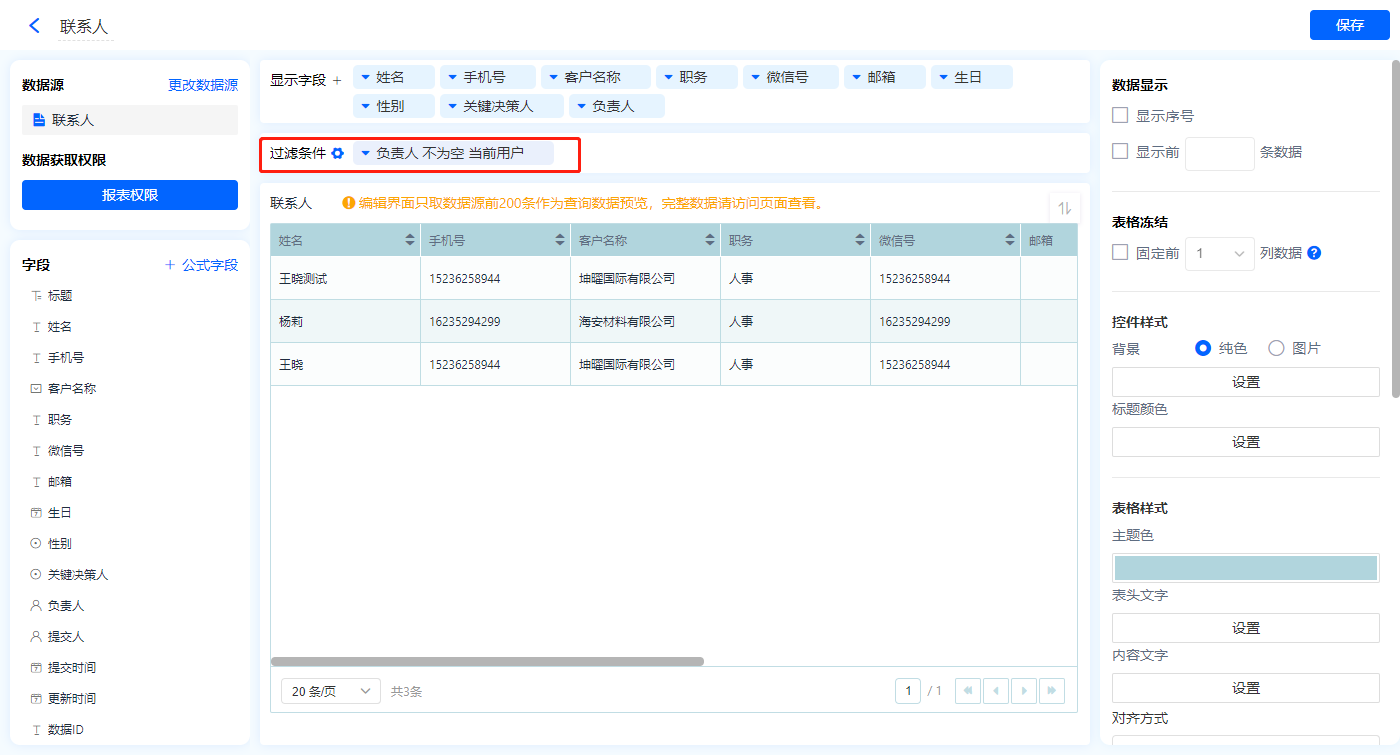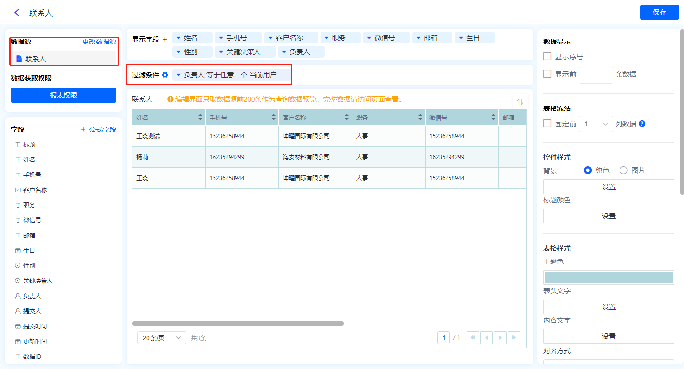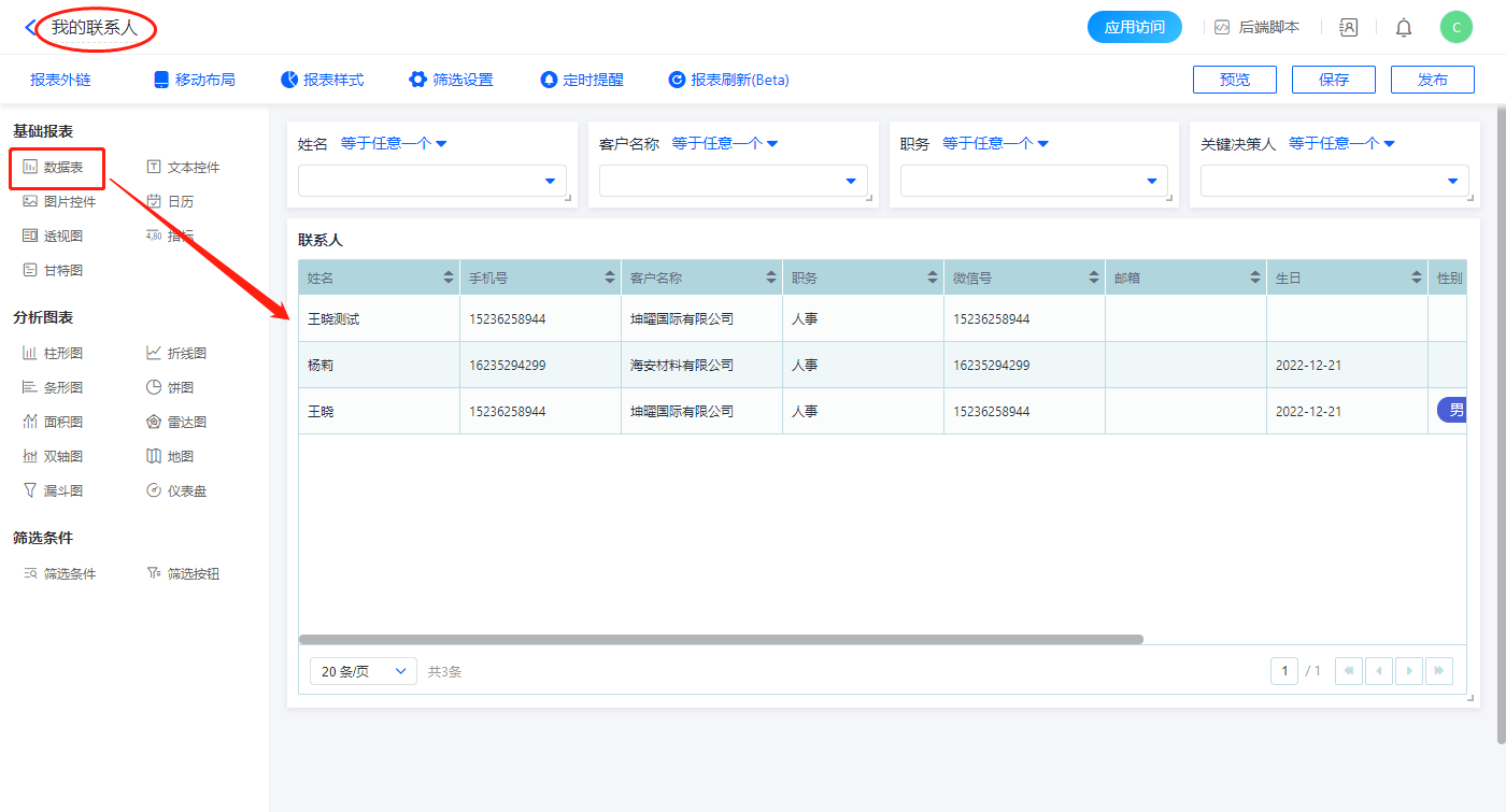 1)新增【我的联系人】报表,用基础报表【数据表】展示数据源为辅助表【联系人】的数据;