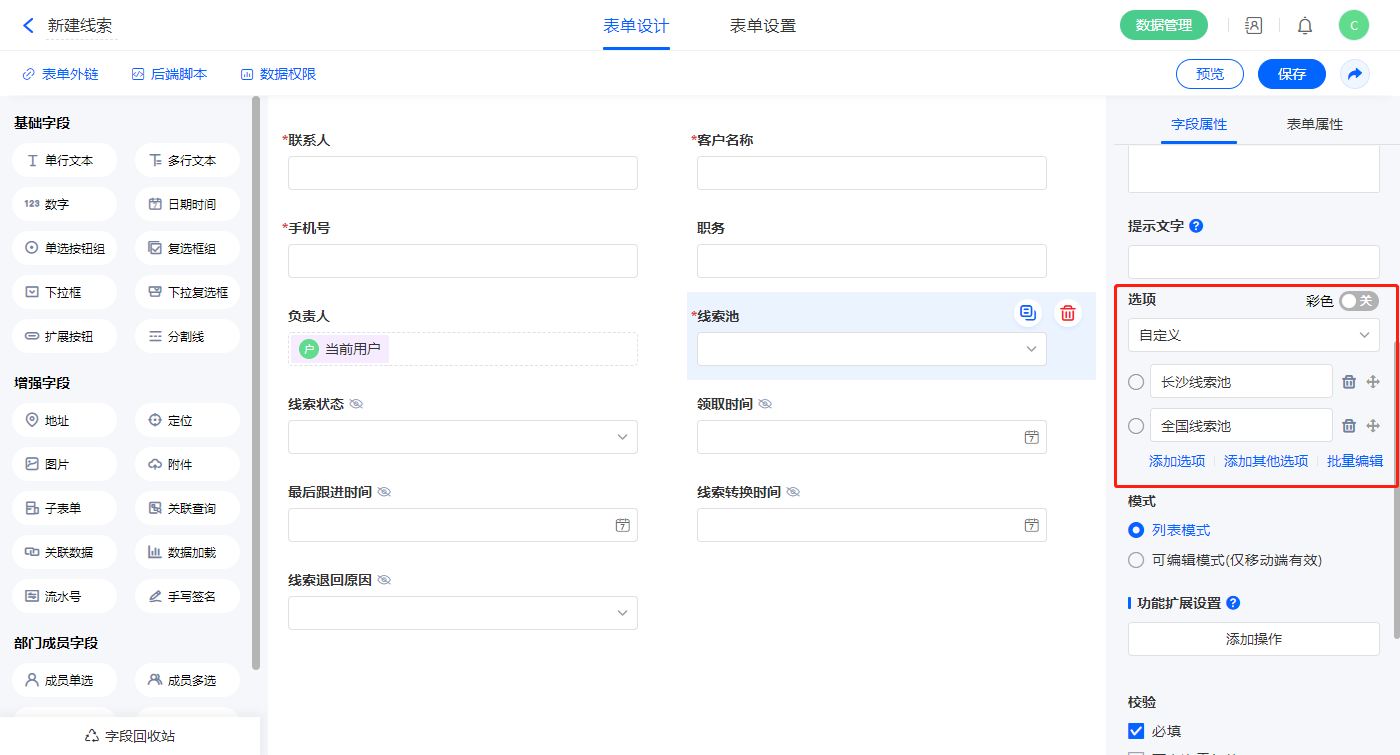 1)选中【线索池】字段,在选项中输入线索池选项;