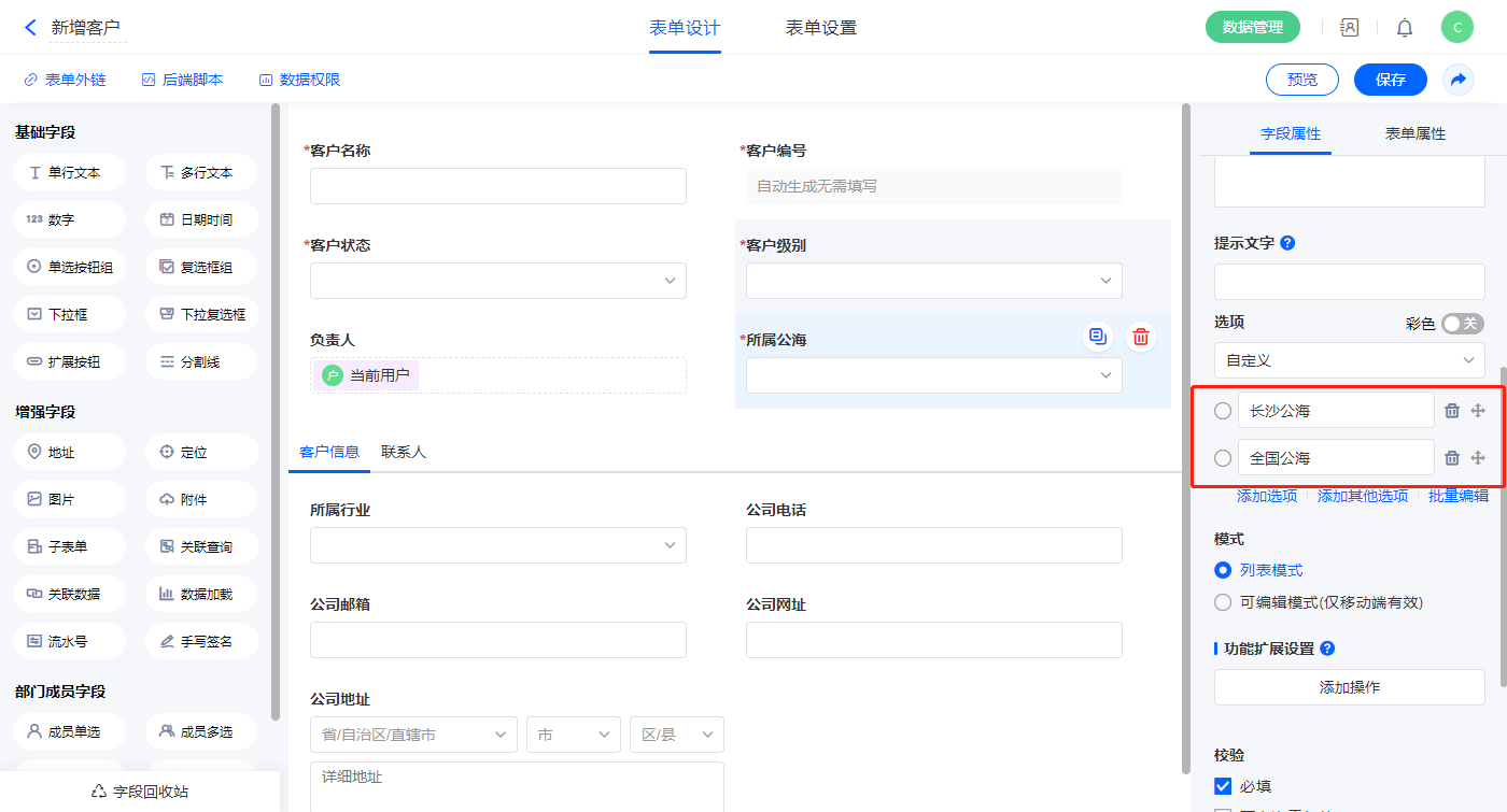 1)选中【所属公海】、【客户级别】、【客户状态】字段,在选项中输入选项;