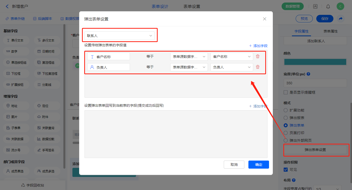 如图弹出表单设置为【联系人】并设置传给弹出表单的字段值;