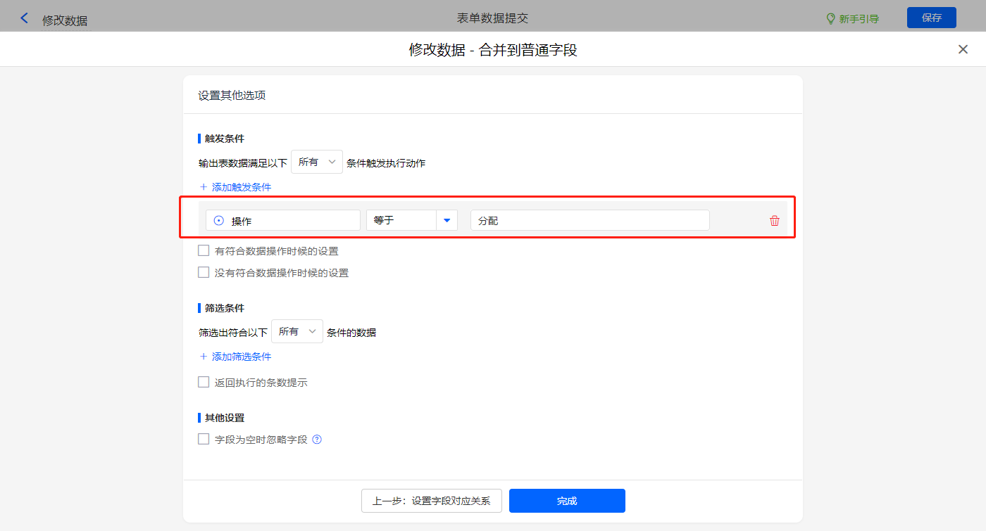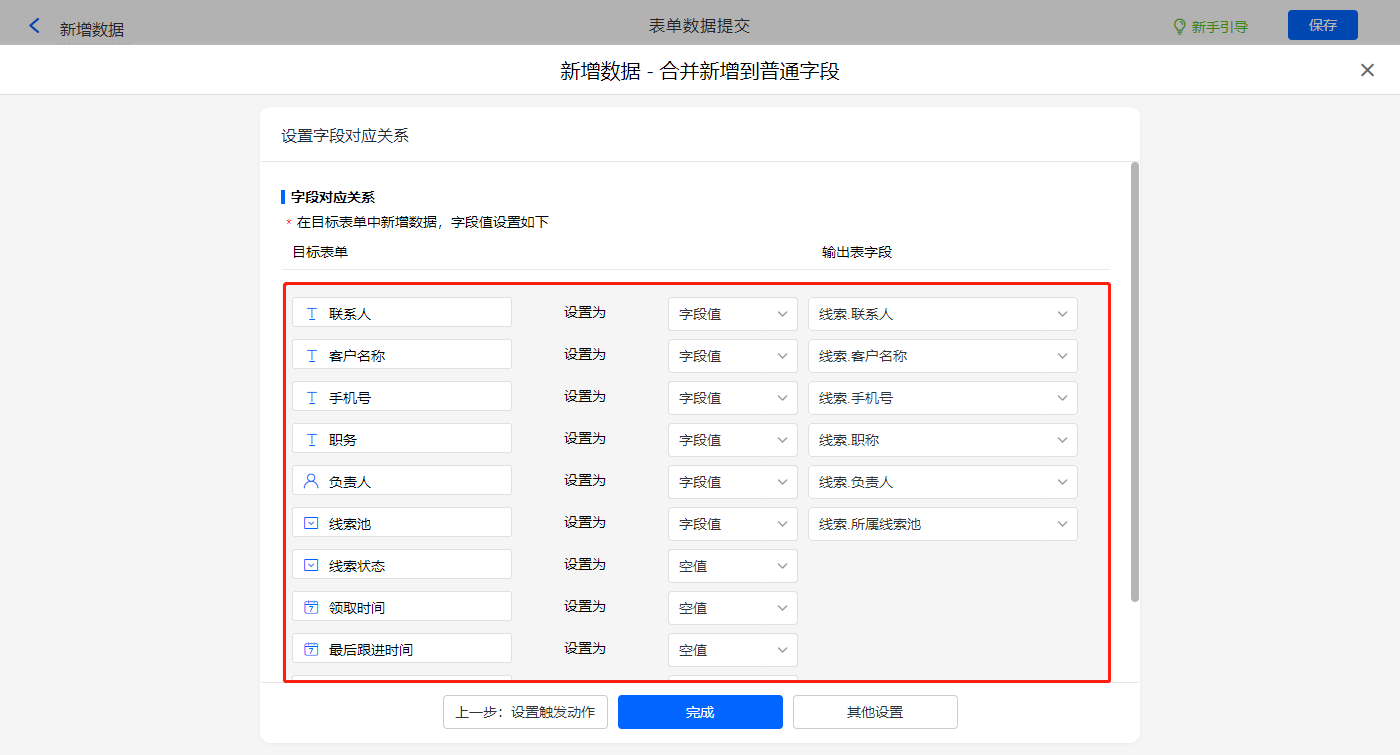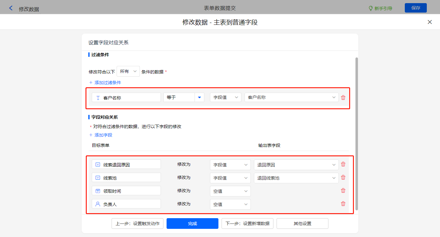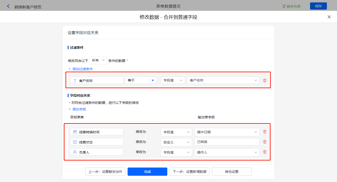 新增修改数据的执行动作,选择修改【新建线索】表单,选择对应过滤条件,以及需要修改的字段,设置好点击【完成】并保存该数据助手;
