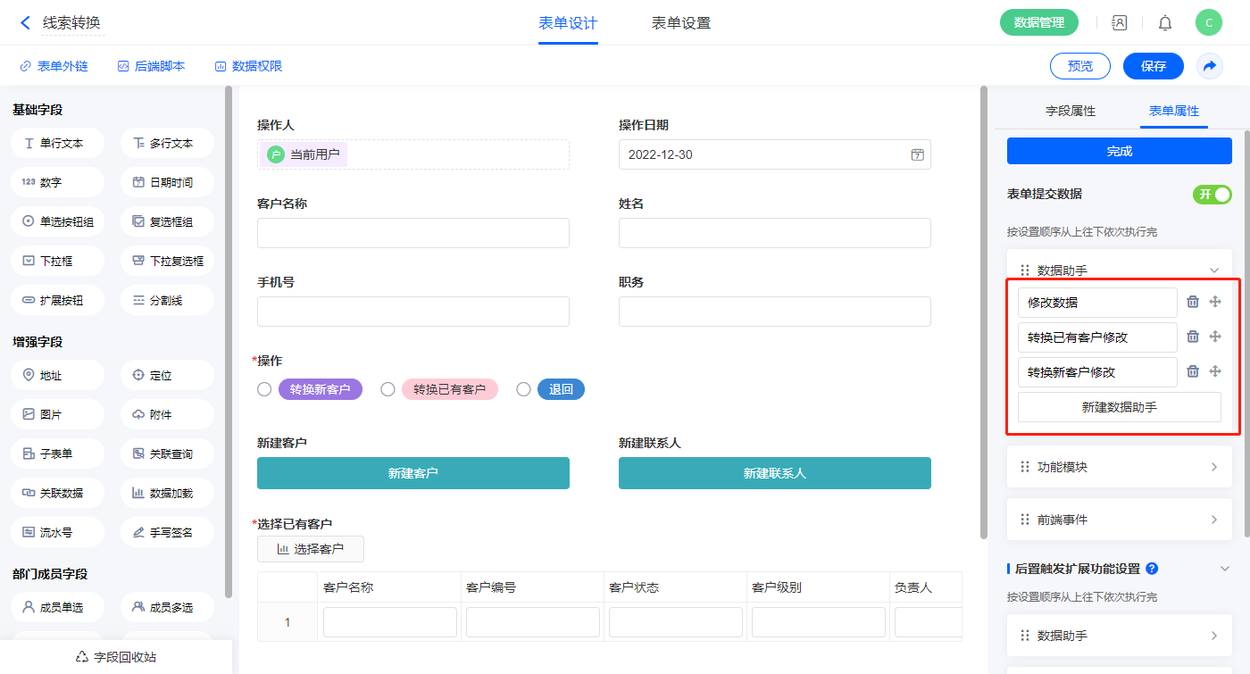 4)表单提交数据新增数据助手修改主表【新建线索】的数据;