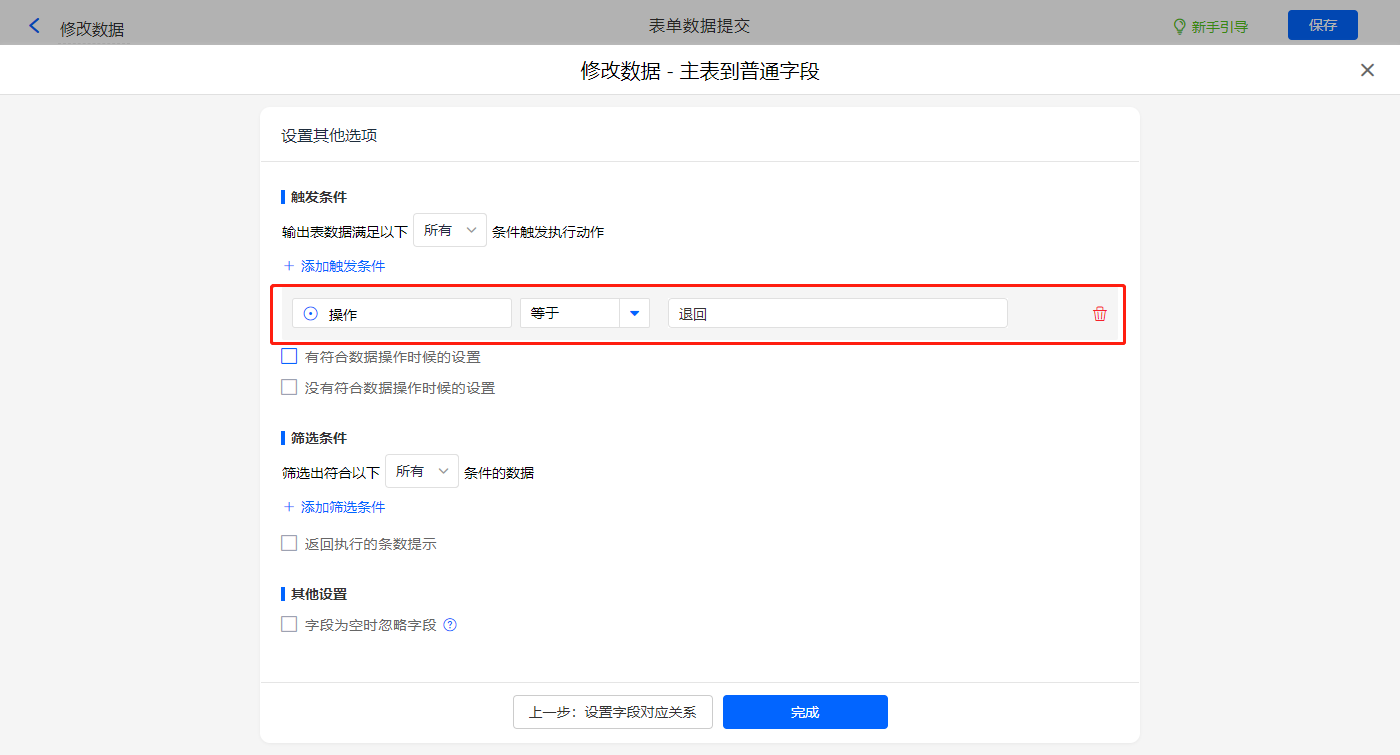 触发条件设置为当【操作】字段等于【退回】,则修改主表【领取时间】、【线索退回原因】、【线索池】、【负责人】字段的值;