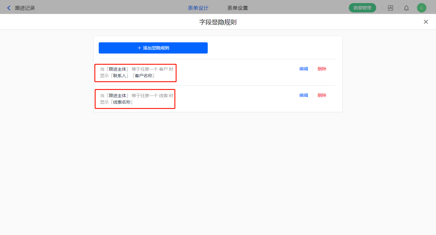 3)设置两条显隐规则,当【跟进主体】单选按钮组字段等于客户显示【联系人因】、【客户名称】两个字段;当【跟进主体】单选按钮组字段等于线索显示【线索名称】字段;
