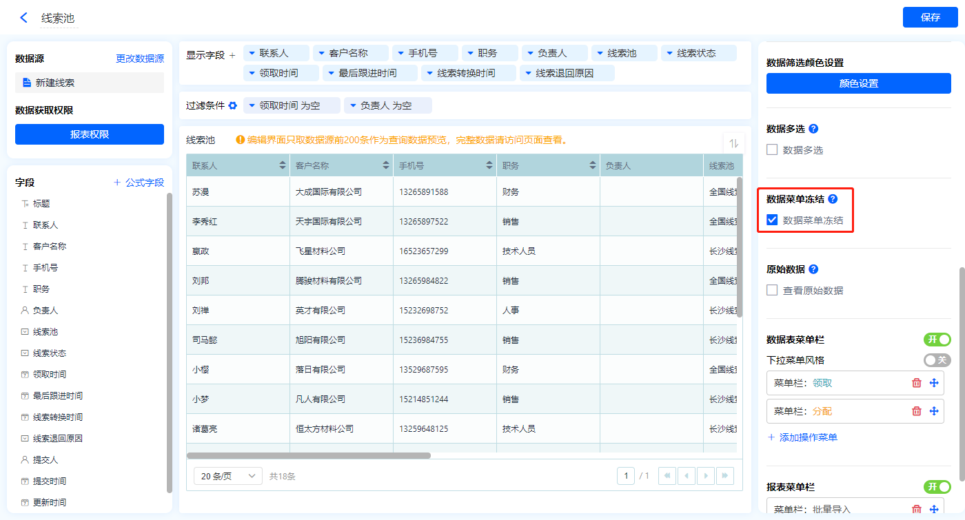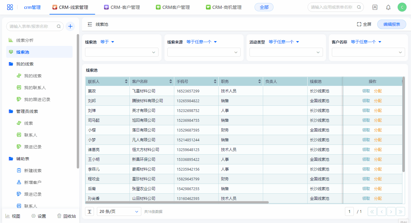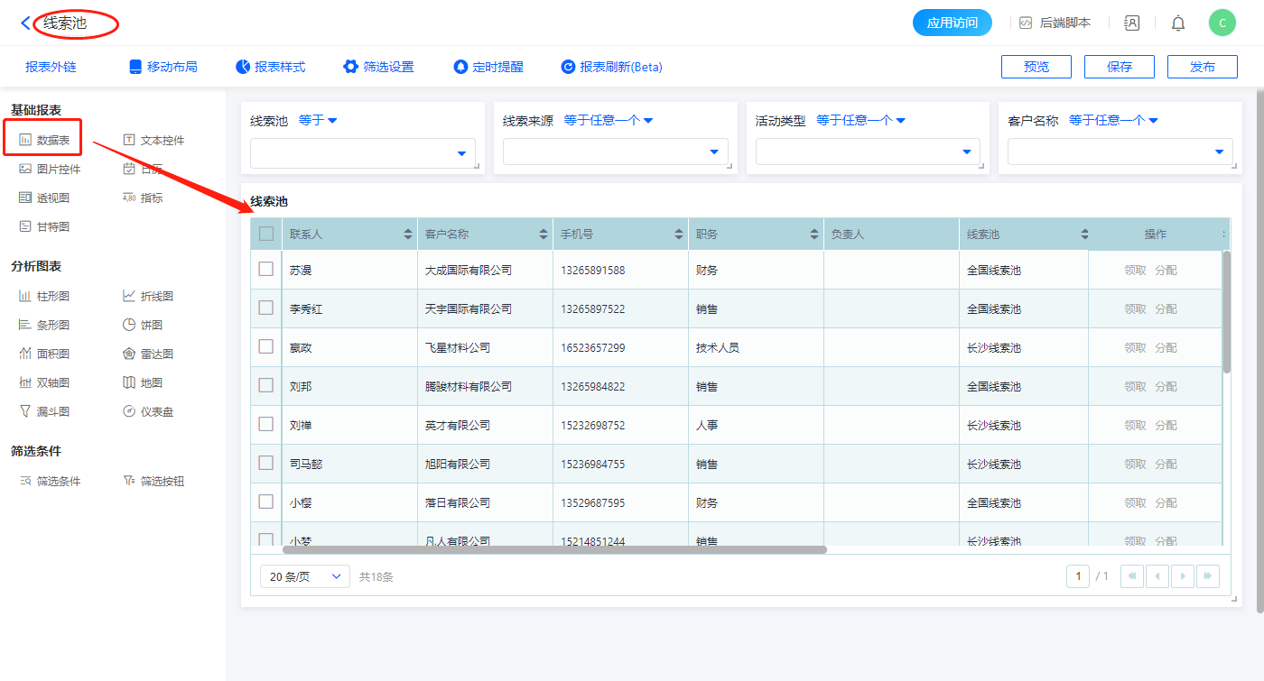 1)新增【线索池】报表,用基础报表【数据表】展示数据源为主表【新建线索】的数据;