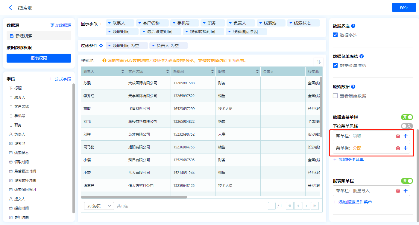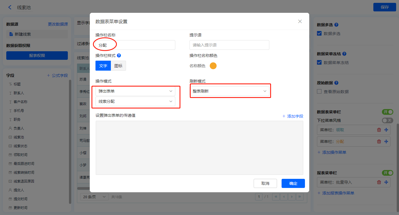 【分配】的菜单栏,操作模式设置为弹出辅助表单【线索分配】,并设置刷新模式为整表刷新;