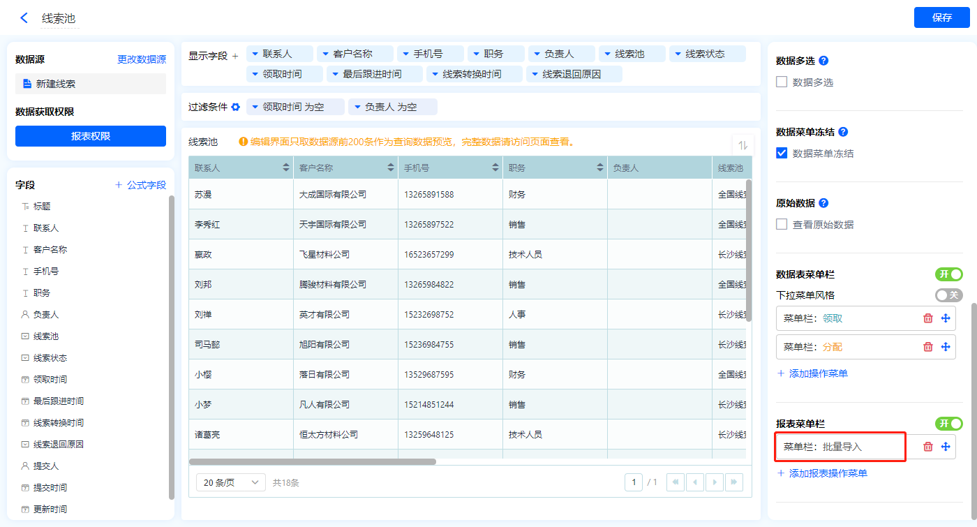 【批量导入】的报表菜单,操作模式设置为弹出辅助表单【线索批量导入】,并设置刷新模式为整表刷新;