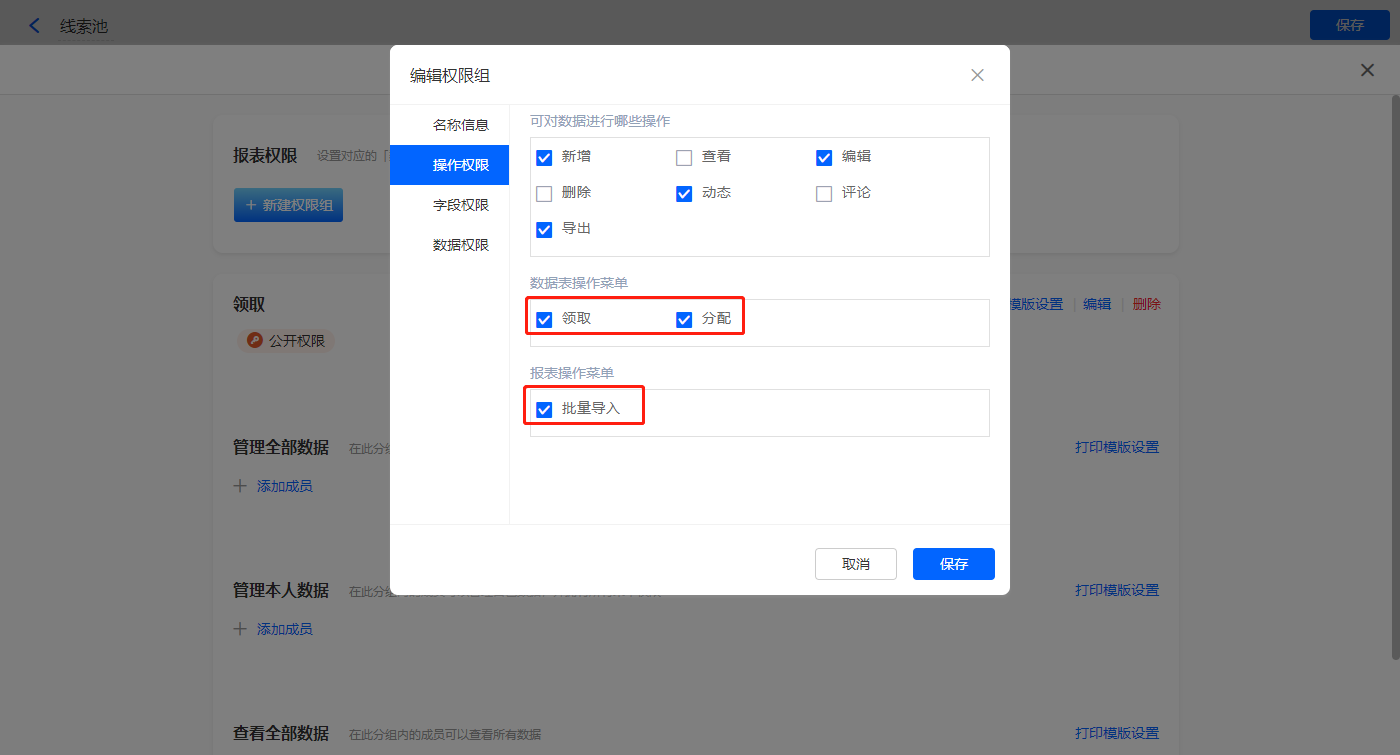 【领取】的菜单栏,操作模式设置为弹出辅助表单【线索领用】,并设置刷新模式为整表刷新;