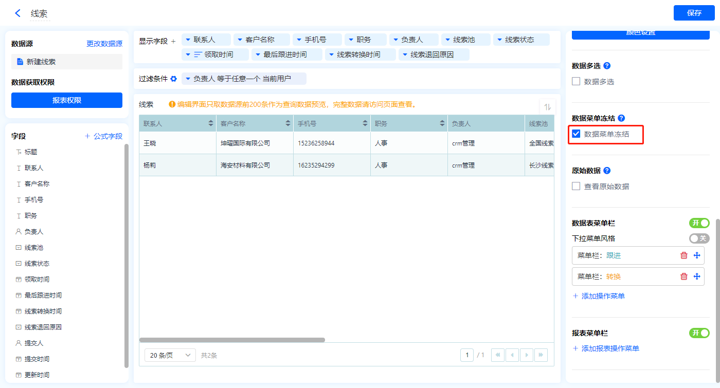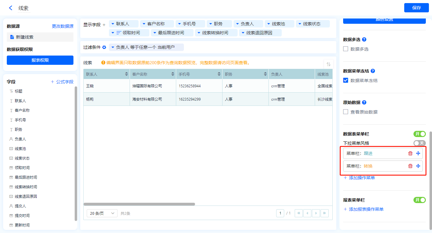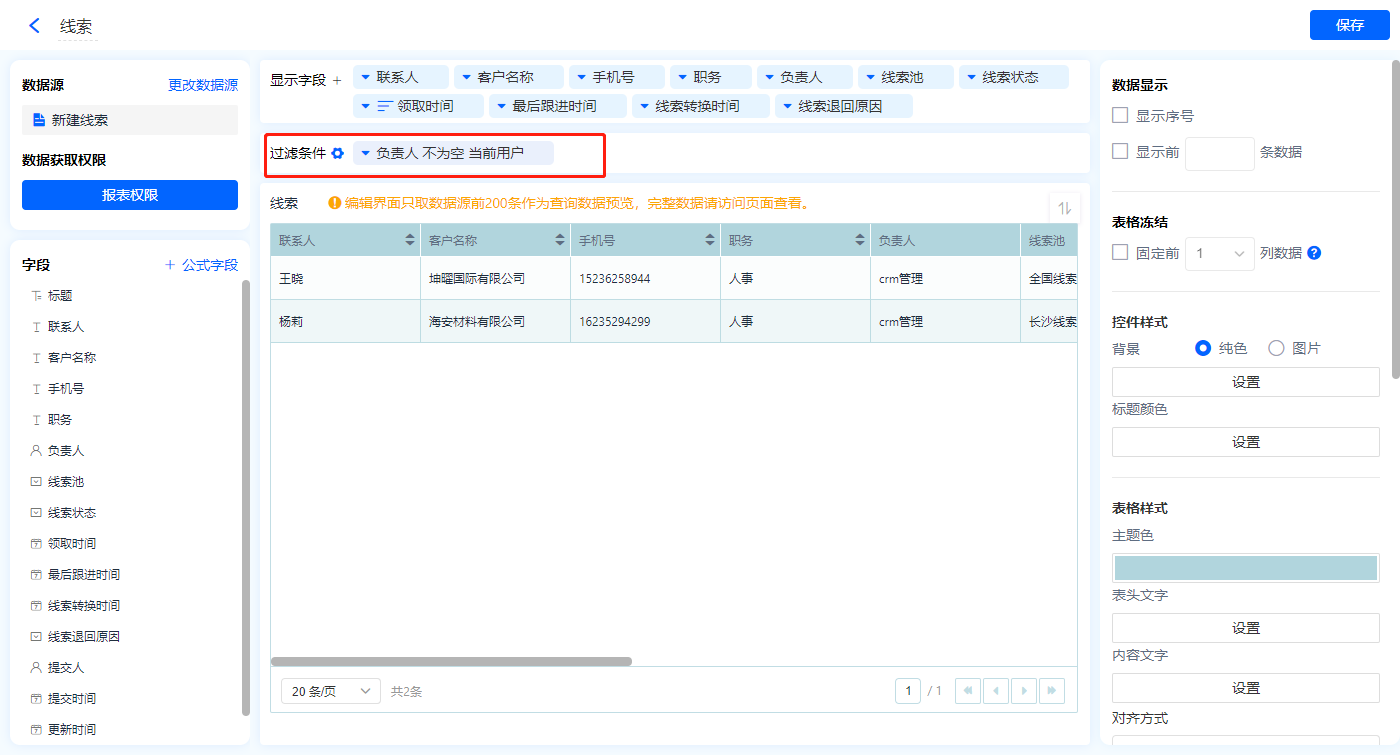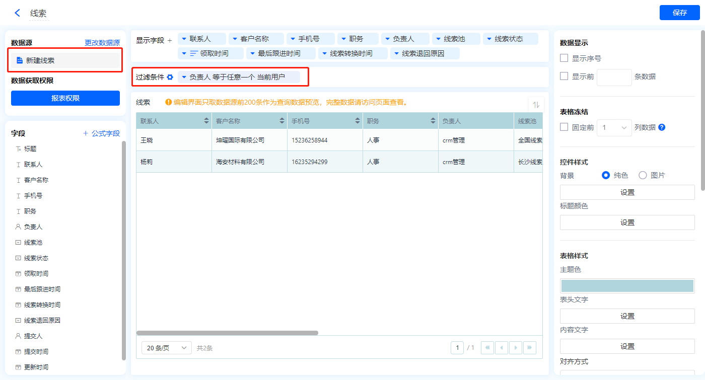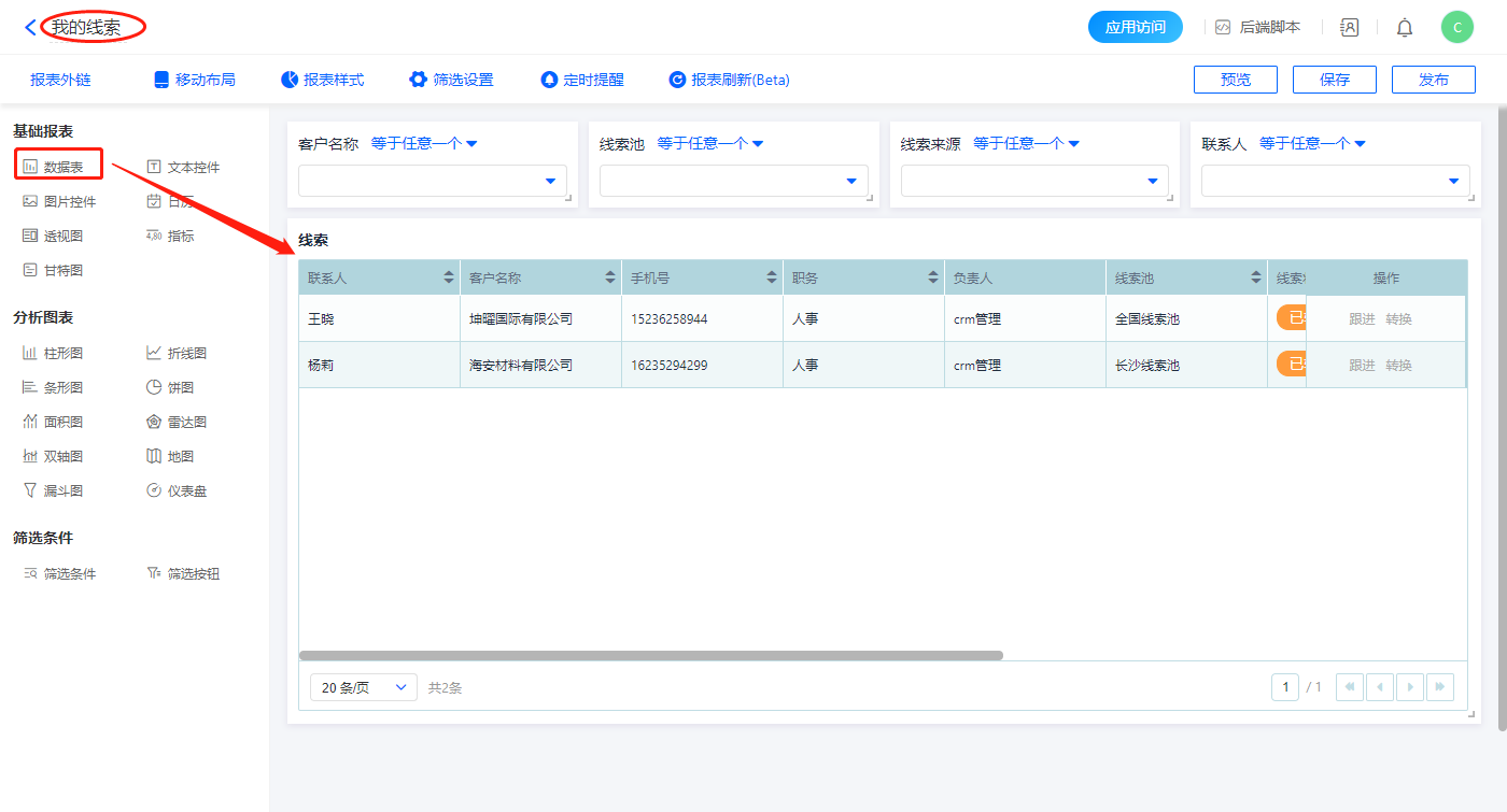 1)新增【我的线索】报表,用基础报表【数据表】展示数据源为主表【新建线索】的数据;