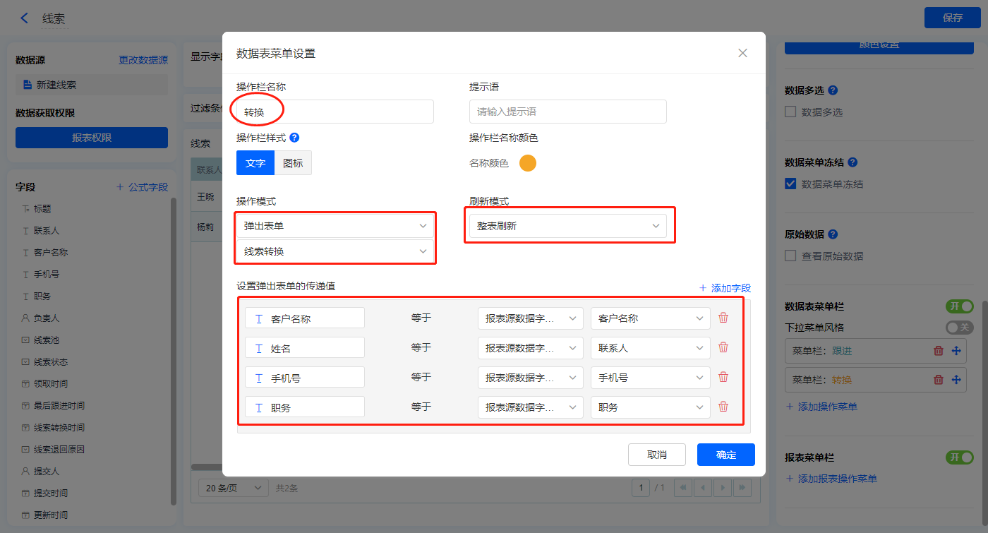 【转换】的菜单栏,操作模式设置为弹出辅助表单【线索转换】,并设置刷新模式为整表刷新,设置表单传递值,点击【确认】;