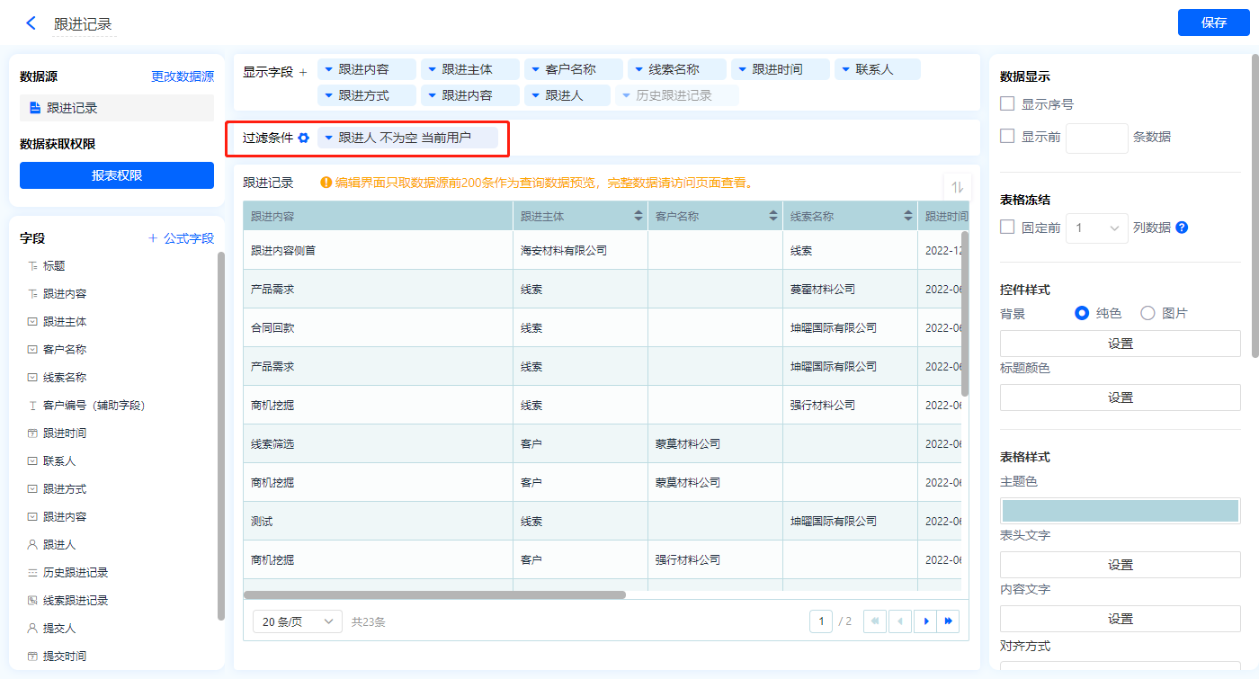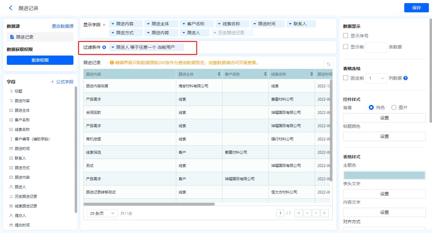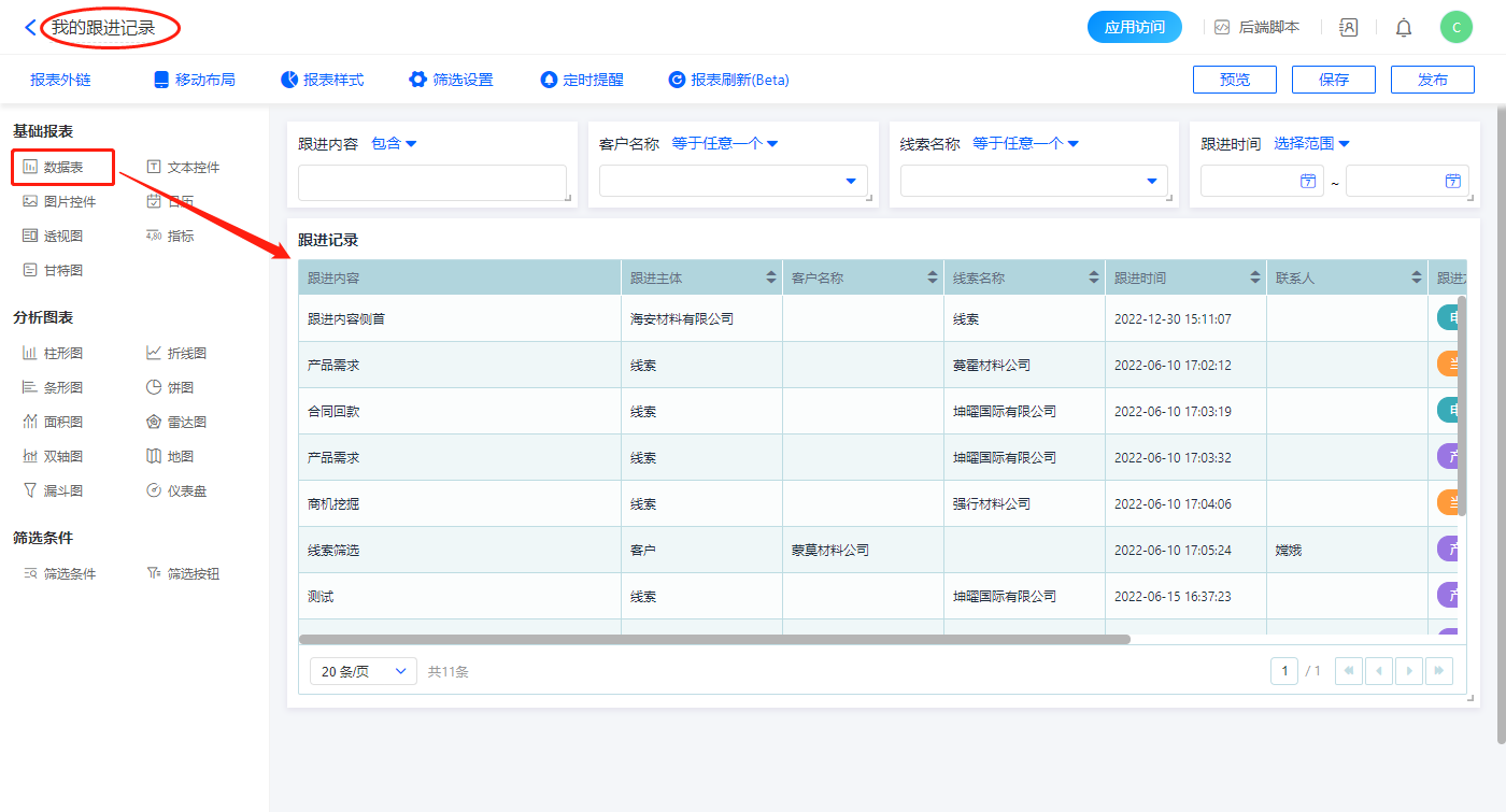1)新增【我的跟进记录】报表,用基础报表【数据表】展示数据源为辅助表【跟记录】的数据;