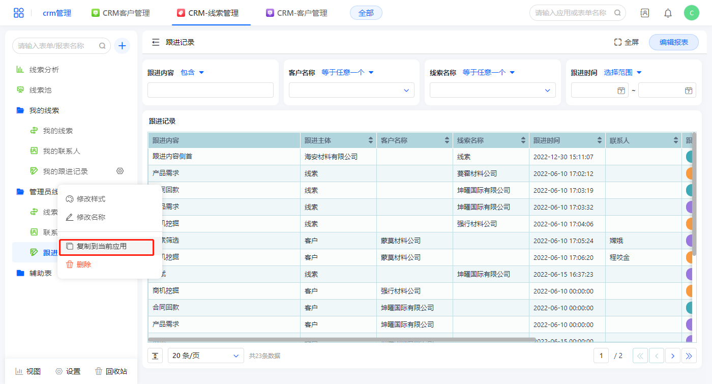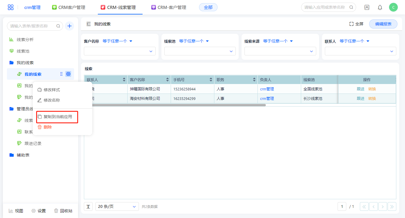 1)该报表为管理员查看,复制【我的线索】报表,名称改为【线索】;