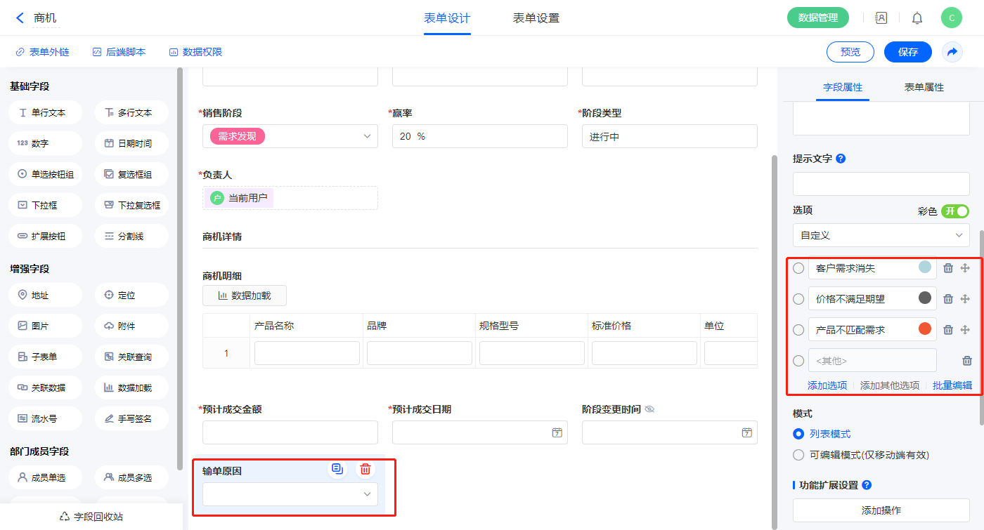 1)设置一条显隐规则,当【销售阶段】字段等于输单显示【输单原因】字段;