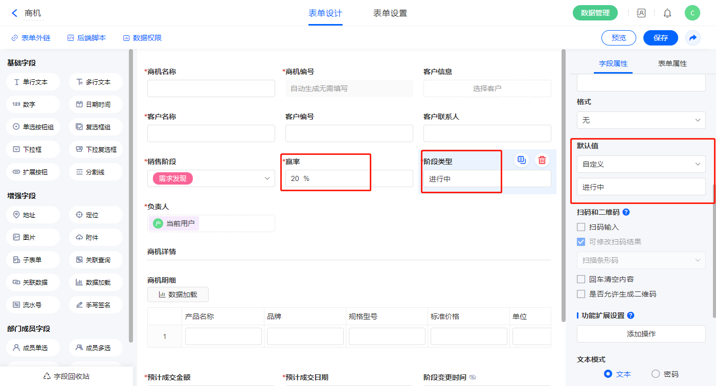 4)【赢率】、【阶段类型】字段设置默认值分别为20%、进行中;