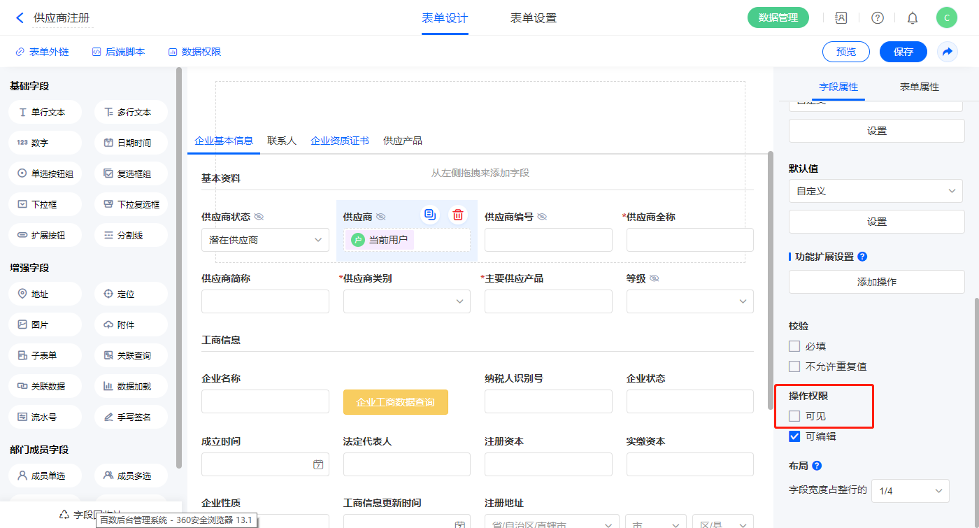 2)【等级】、【供应商状态】、【供应商编号】、【供应商】四个字段设置操作权限为不可见;