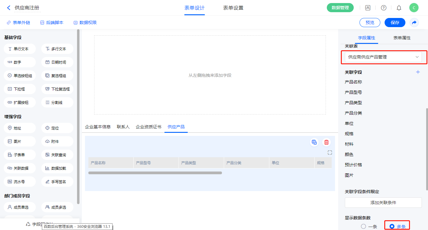 【供应产品】关联查询字段,设置关联表为【供应商供应产品管理】并如图选择关联字段,设置显示数据条数为多条,并设置关联条件为【供应商】字段;