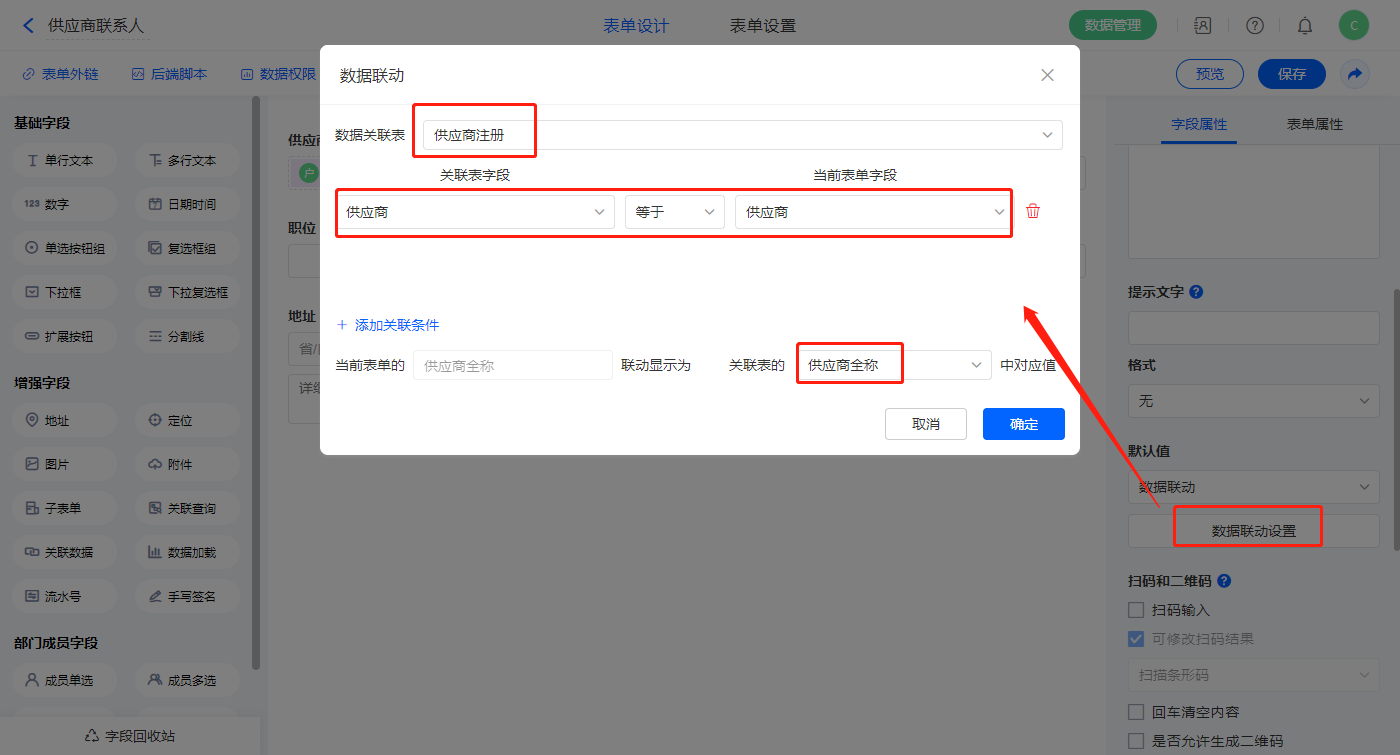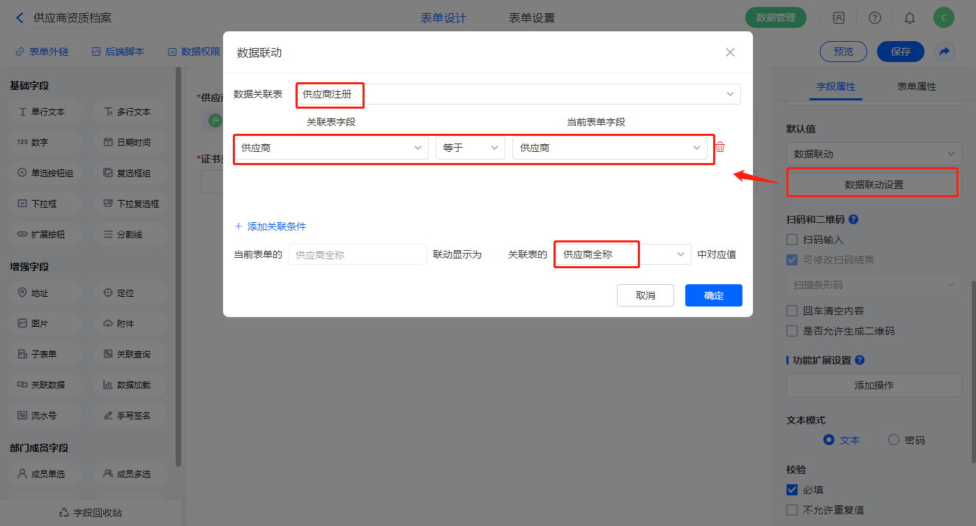 1)【供应商全称】字段,设置默认值为数据联动,设置联动条件及联动字段;