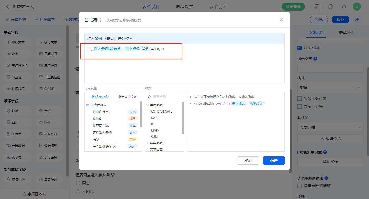 5)【(辅助)得分校验】字段,设置默认值为公式编辑,设置公式:“IF(准入条例.最高分-准入条例.得分>=0,0,1)”;