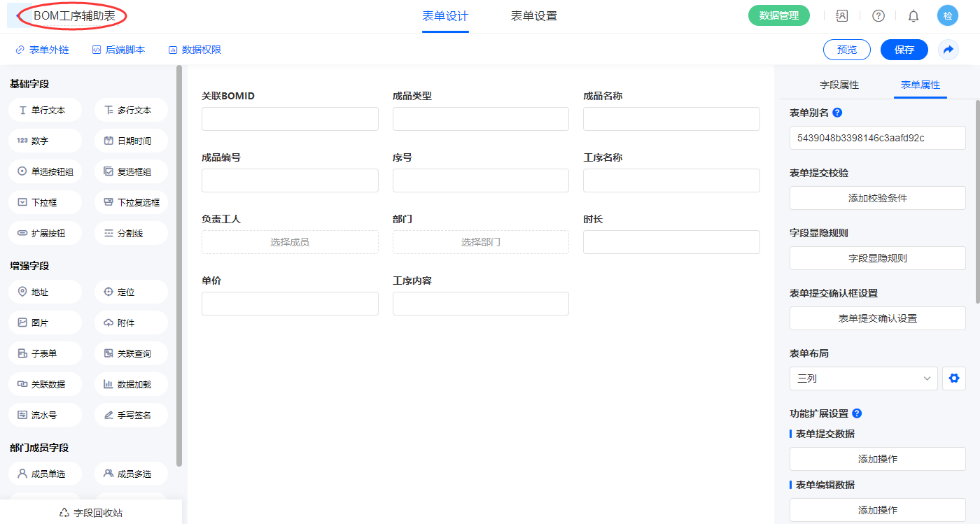 2.4、表单【产品结构清单(BOM)】字段及表单属性设置