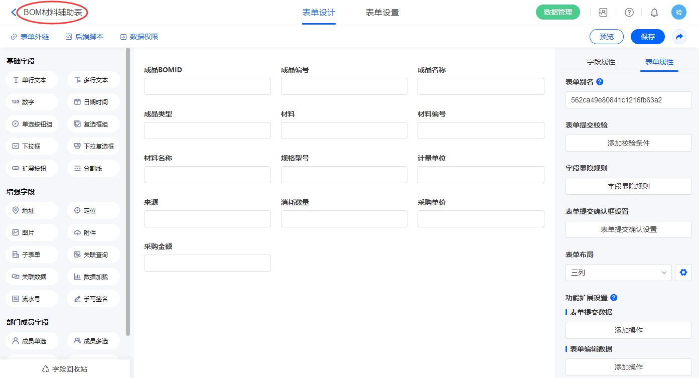 9)新增表单【BOM材料辅助表】,字段设置如下;