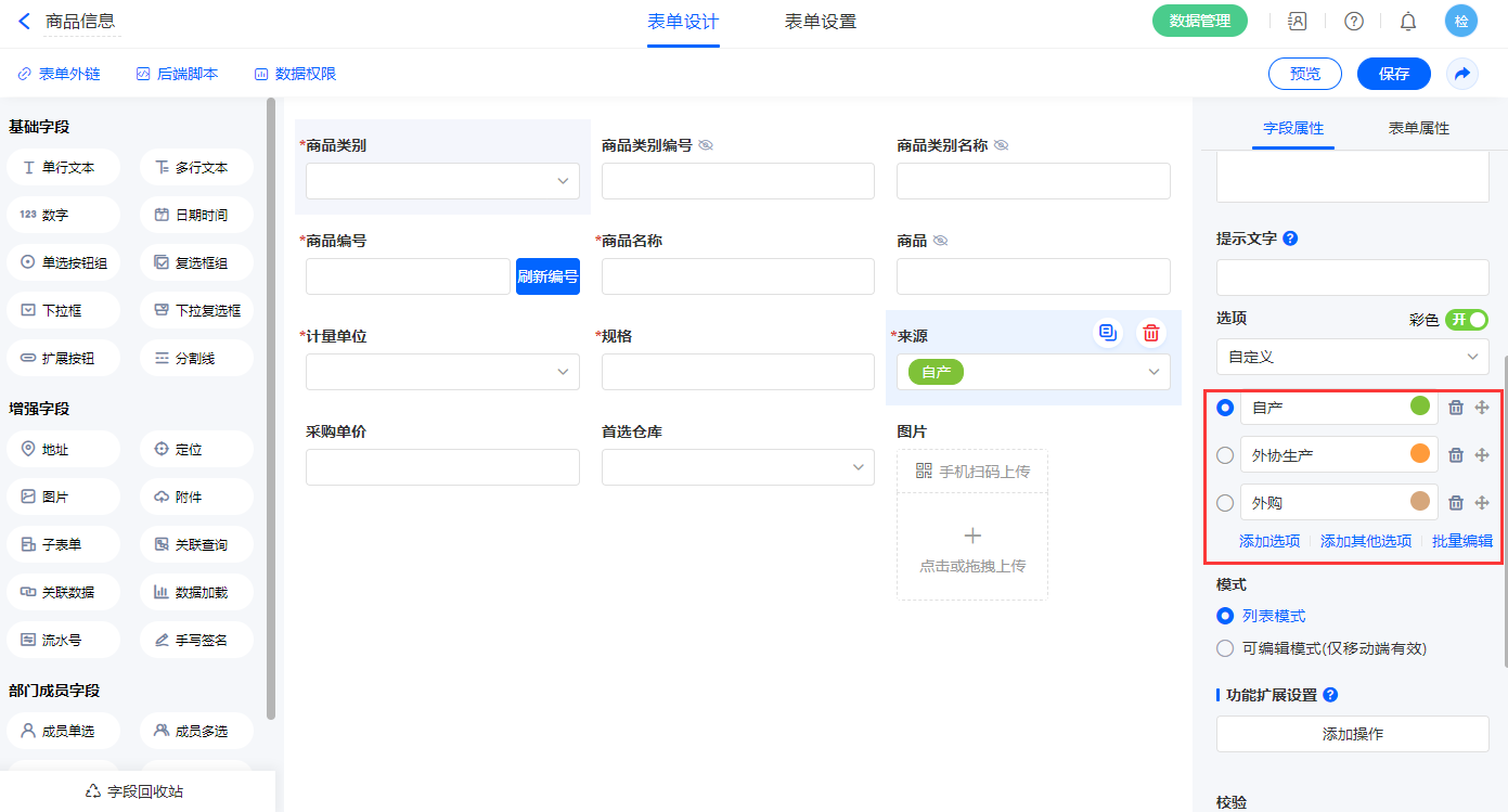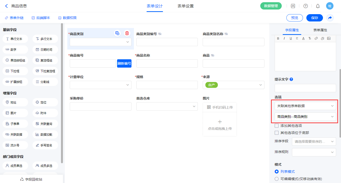 1)【商品类别】字段,选择设置为关联其他表单数据,关联商品类别的【商品类别】字段;