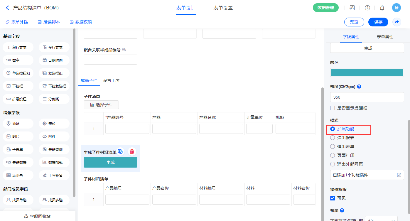4)【生成子件材料清单】、【生成子件工序清单】扩展按钮字段,模式选择扩展功能;