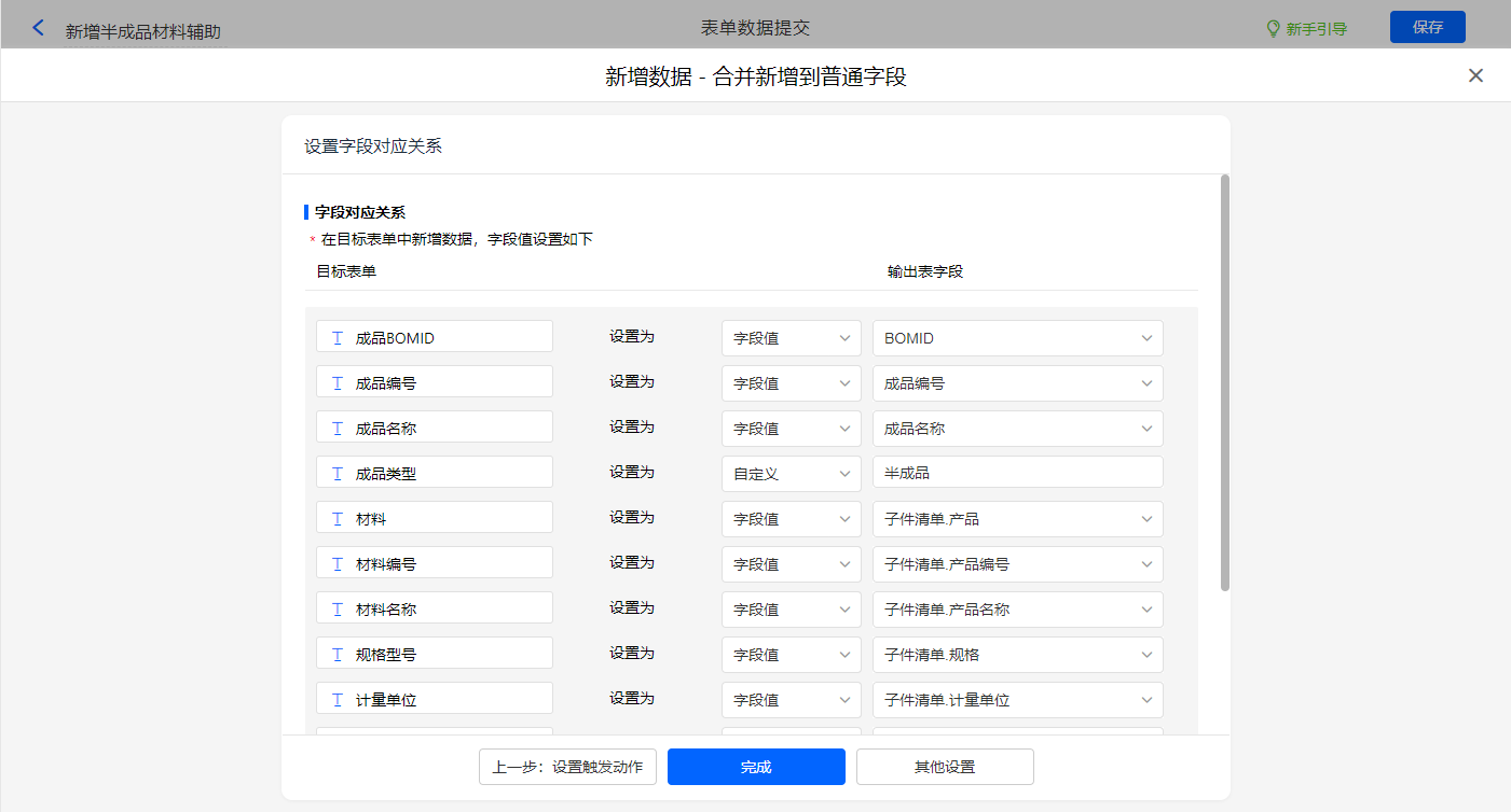 其他设置触发条件为【BOM类型】字段等于半成品,设置好点击【完成】并保存该数据助手;