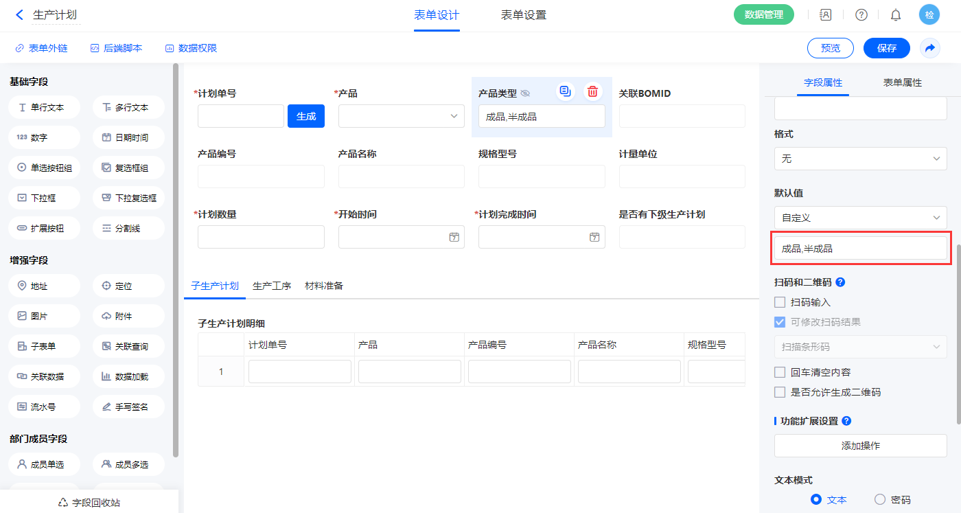 2.5、表单【生产计划】字段及表单属性设置