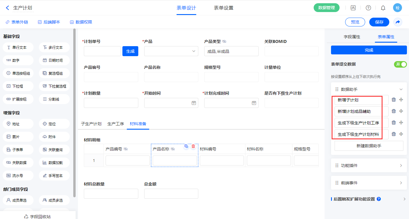| 计划数量 | 数字 | 材料明细 | 子表单 |
