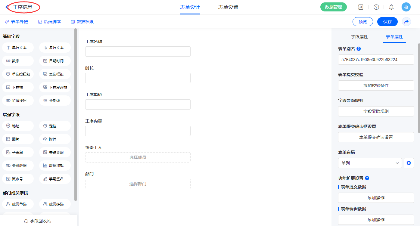 3)新增表单【工序信息】,字段设置如下;