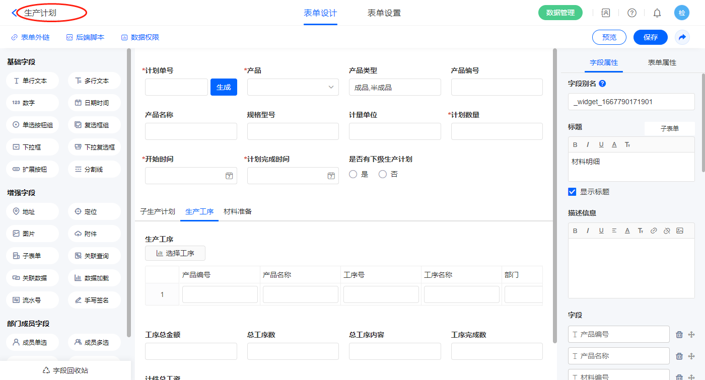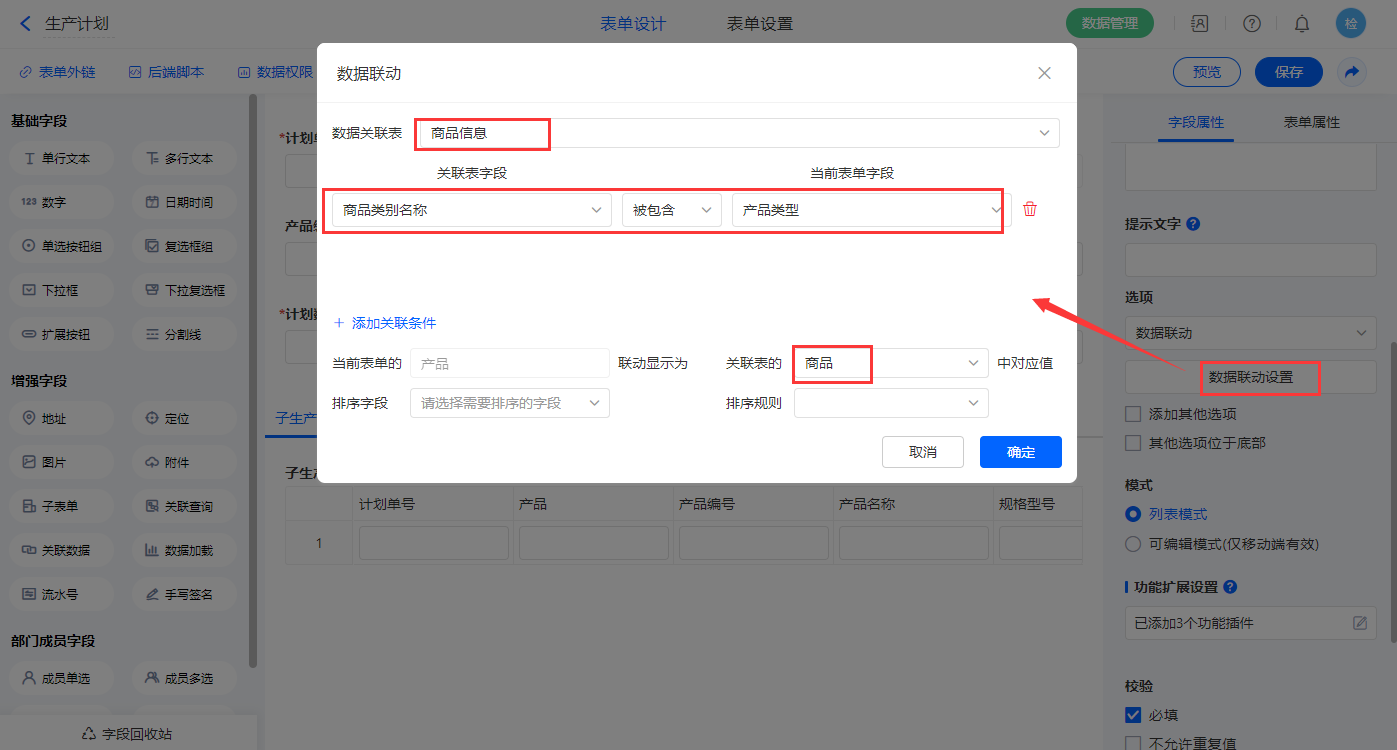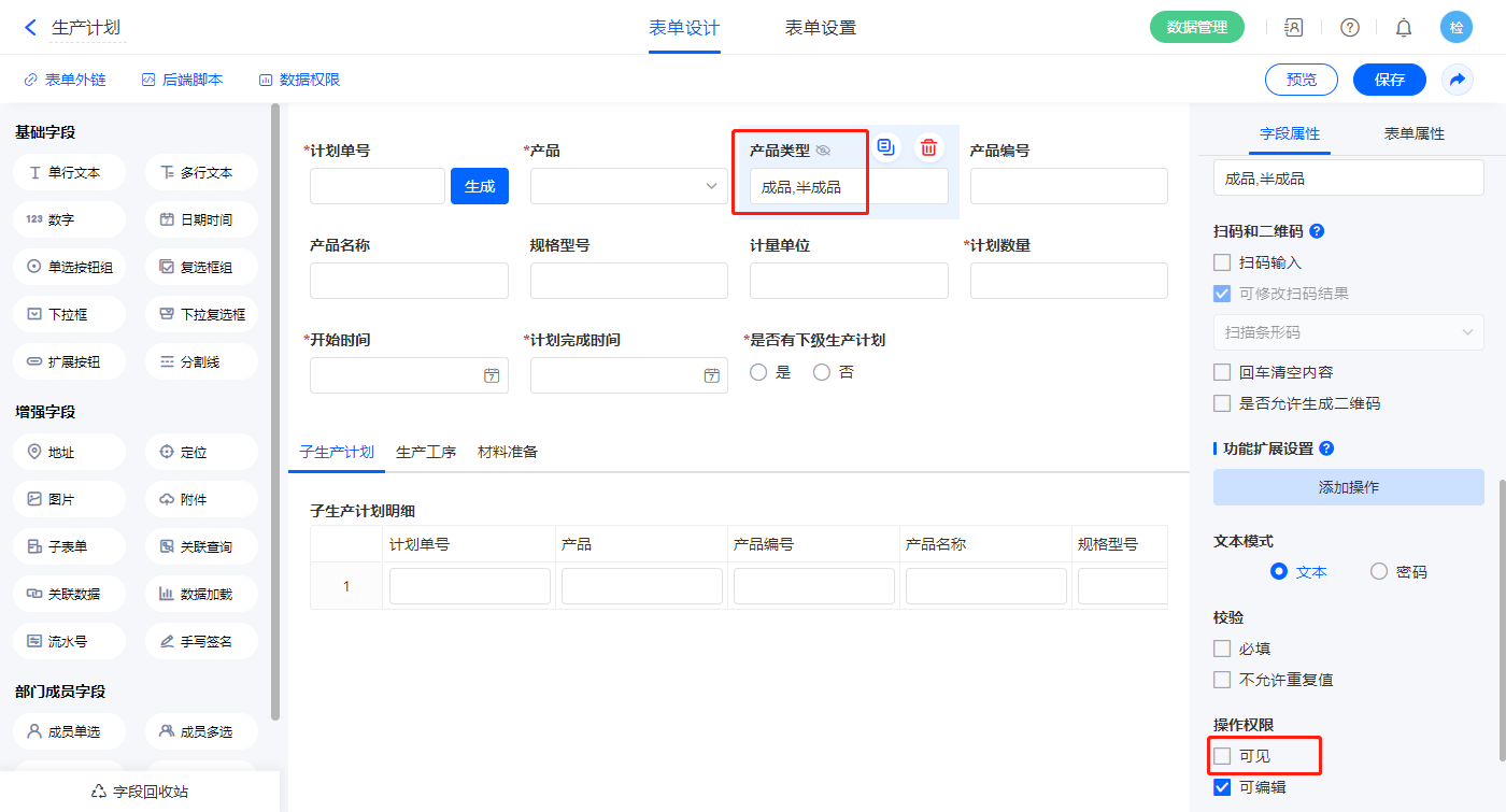 2.5、表单【生产计划】字段及表单属性设置