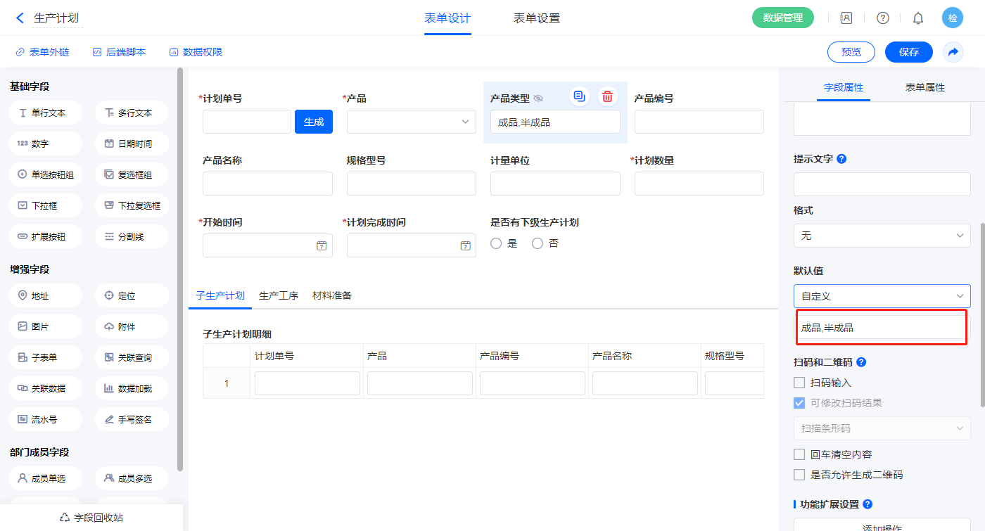1)【产品类型】字段,设置默认值为“成品,半成品”;