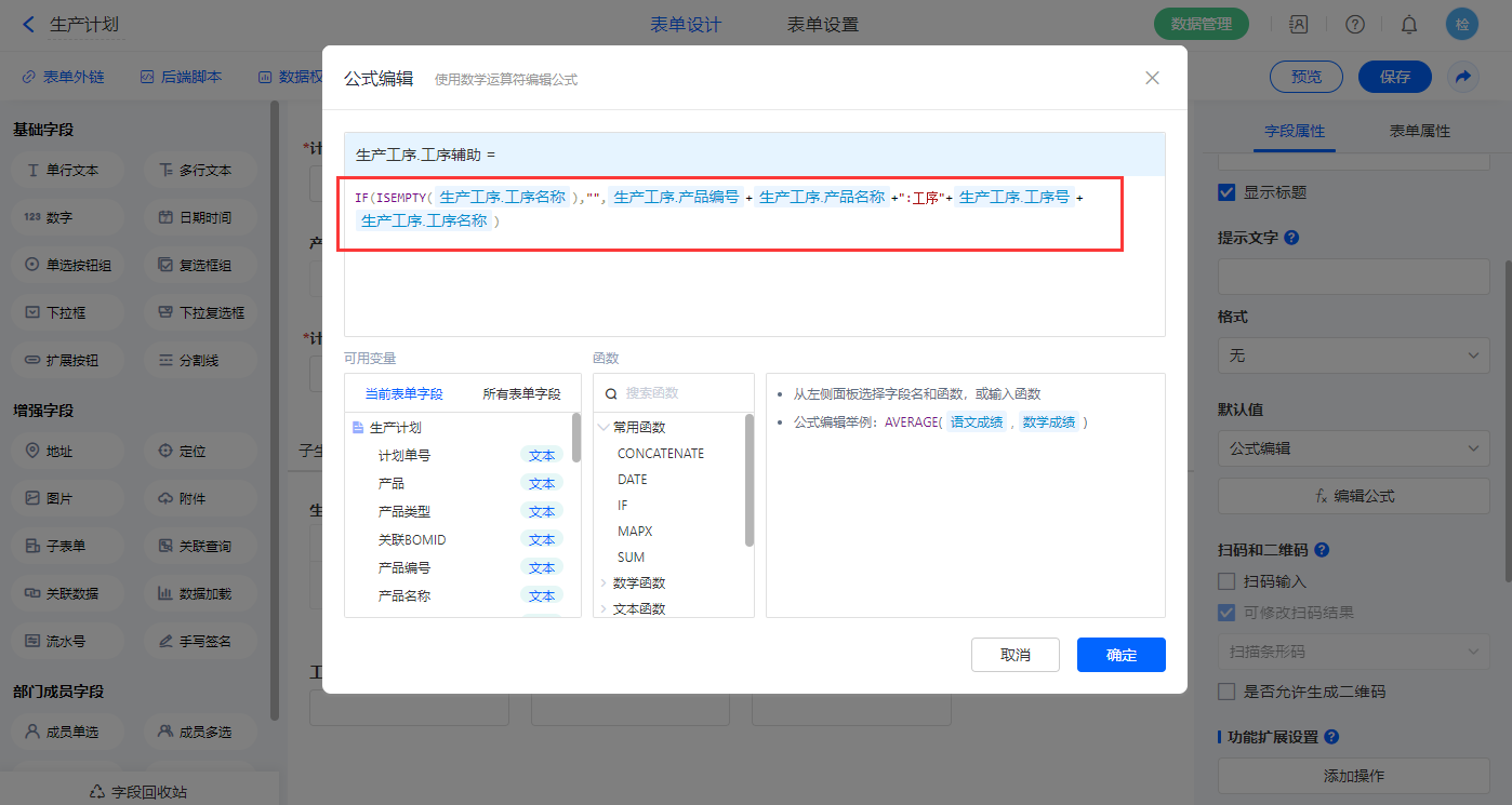 3)【生产工序.工序辅助】字段,设置默认值为公式编辑,如图设置公式;