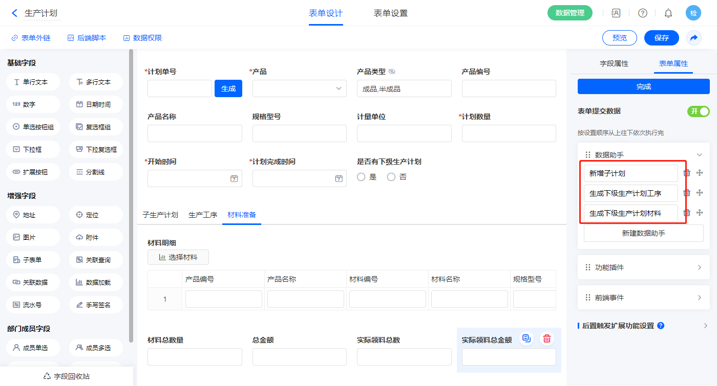 计划数量 数字 材料明细 子表单