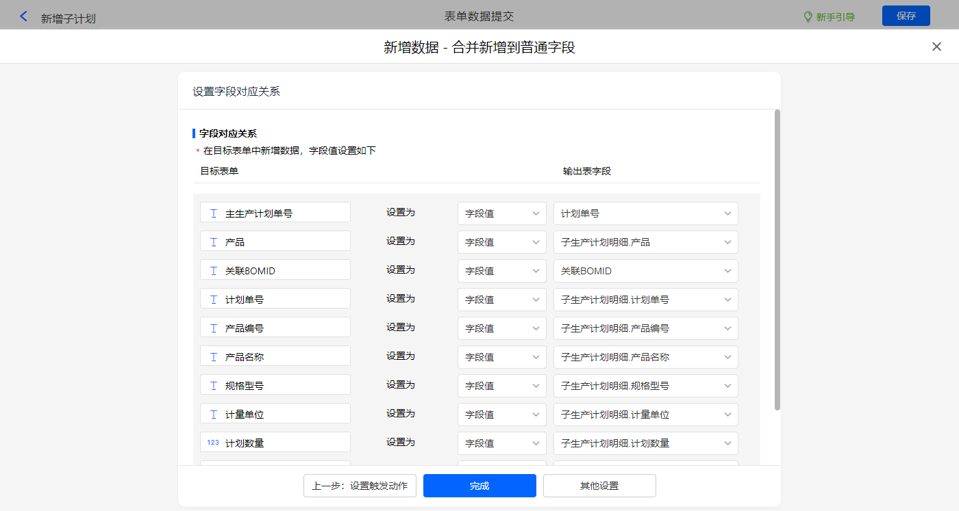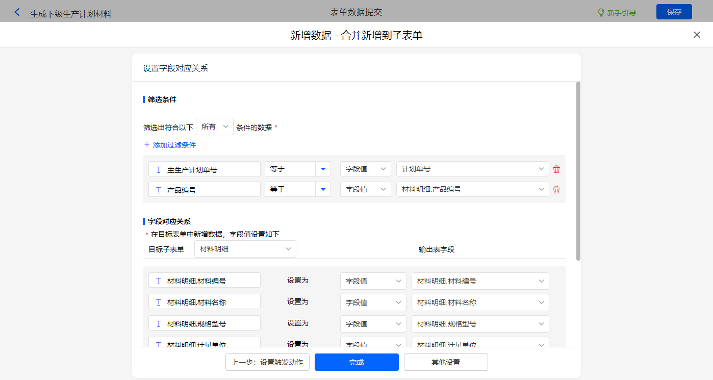 其他设置触发条件为【是否有下级子生产计划】字段等于有,设置好点击【完成】并保存该数据助手;
