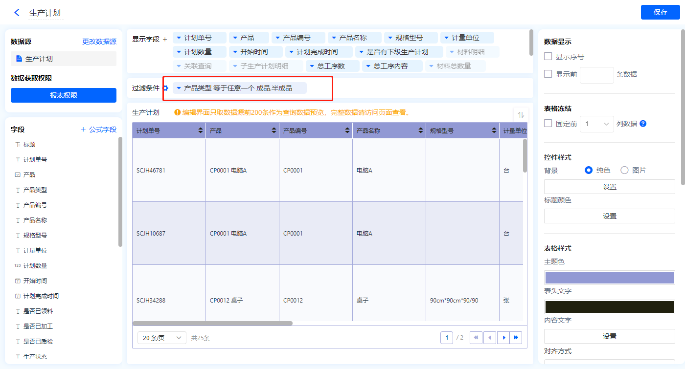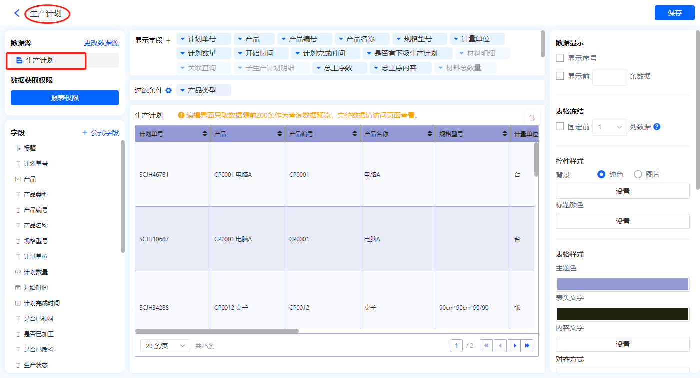 1)新增【主生产计划列表】报表,用基础报表【数据表】展示数据源为表单【生产计划】的数据;