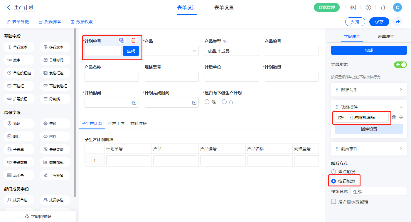 5)【计划单号】字段添加扩展功能,触发方式为按钮触发,按钮名称为生成;